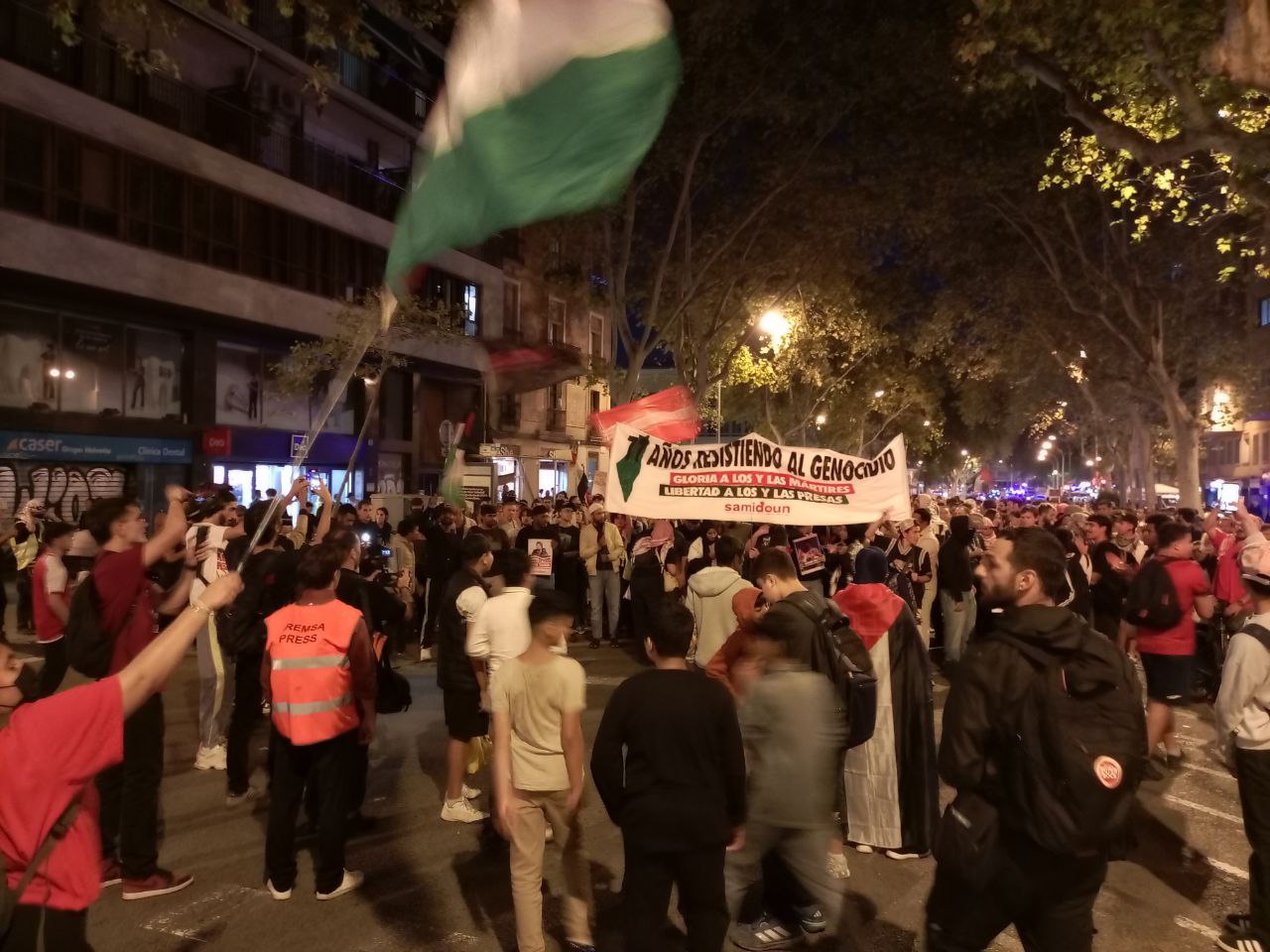 Un miler de manifestants convocats per Samidoun (Xarxa de Solidaritat amb lxs Presxs Palestinxs) van participar ahir al vespre en la marxa sota el lema “77 anys resistint al genocidi”. La manifestació va recórrer els barris del Raval i Sant Antoni de Barcelona, perimetrada en tot moment per una vintena de furgons de la Brigada Mòbil dels Mossos d’Esquadra, que van impedir que circulés en direcció al port o les Rambles. Diversos manifestants van trencar els vidres d’un establiment Burger King de la ronda de Sant Pau, empresa a la que acusen de col·laborar amb l’exèrcit d’Israel. Al final de la marxa, a la plaça de la Universitat, desenes de manifestants i vianants van ser identificats per agents de paisà encaputxats. Segons fonts dels Mossos d’Esquadra, sis van ser detinguts acusats de resistència i desobediència a l’autoritat. Una quinzena, a més, van ser sancionats per participar en una manifestació no comunicada.