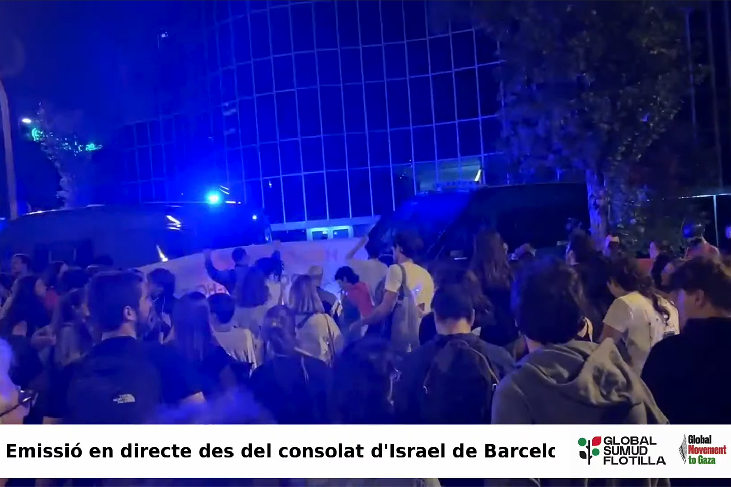 Centenars de persones han acudit davant del consolat d’Israel a Barcelona i tallen la ronda del Mig. La protesta s’ha convocat immediatament després de conèixer-se l’assalt de la flotilla. Des de l’organització l’han denunciat com un “atac il·legal contra personal humanitari desarmat en aigües internacionals”. Demanen als governs i les institucions internacionals exigir seguretat i l’alliberament de les persones a bord. Els manifestants han desplegat una pancarta des d’un pont i han llançat nombrosos ous amb pintura vermella a la façana de vidre de la seu consular.