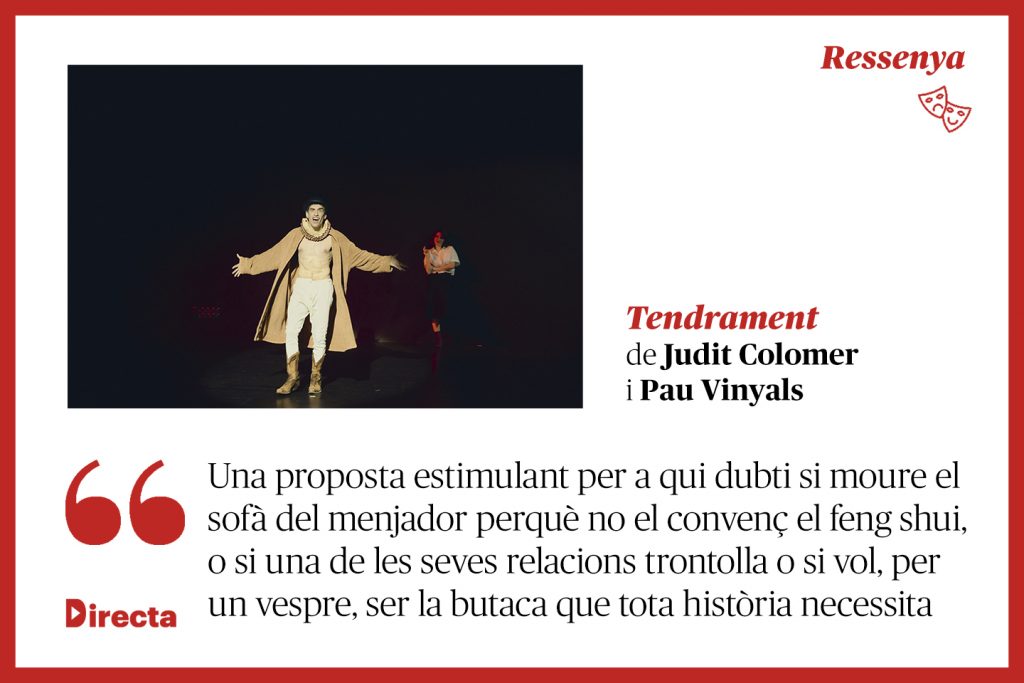 Aquests dies es representa a la Sala Beckett de Barcelona 'Tendrament', un muntatge de Judit Colomer i Pau Vinyals que indaga en la quotidianitat i la vulnerabilitat d'una parella, enmirallant-la amb l'estructura dels espais físics i abstractes en què habita