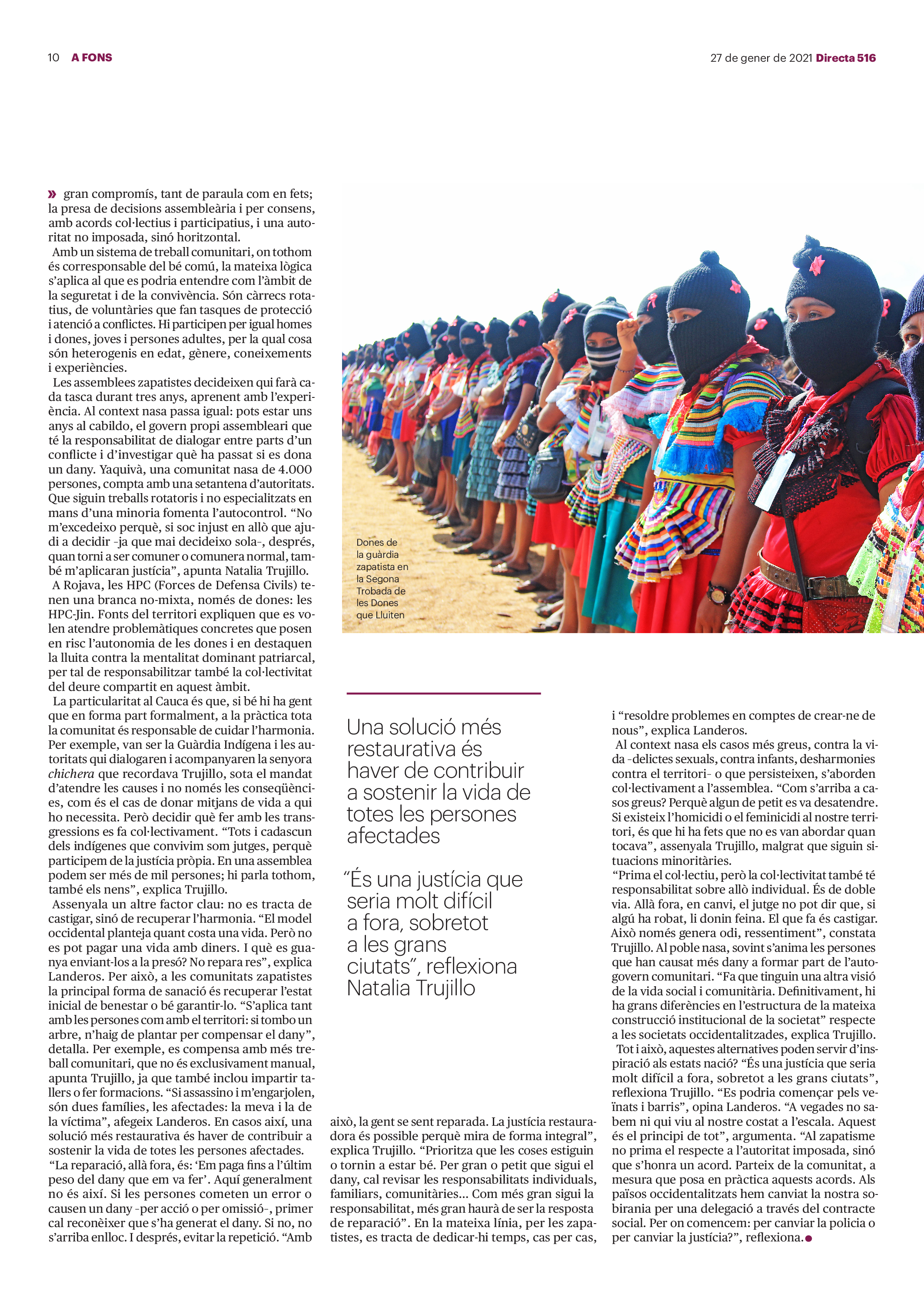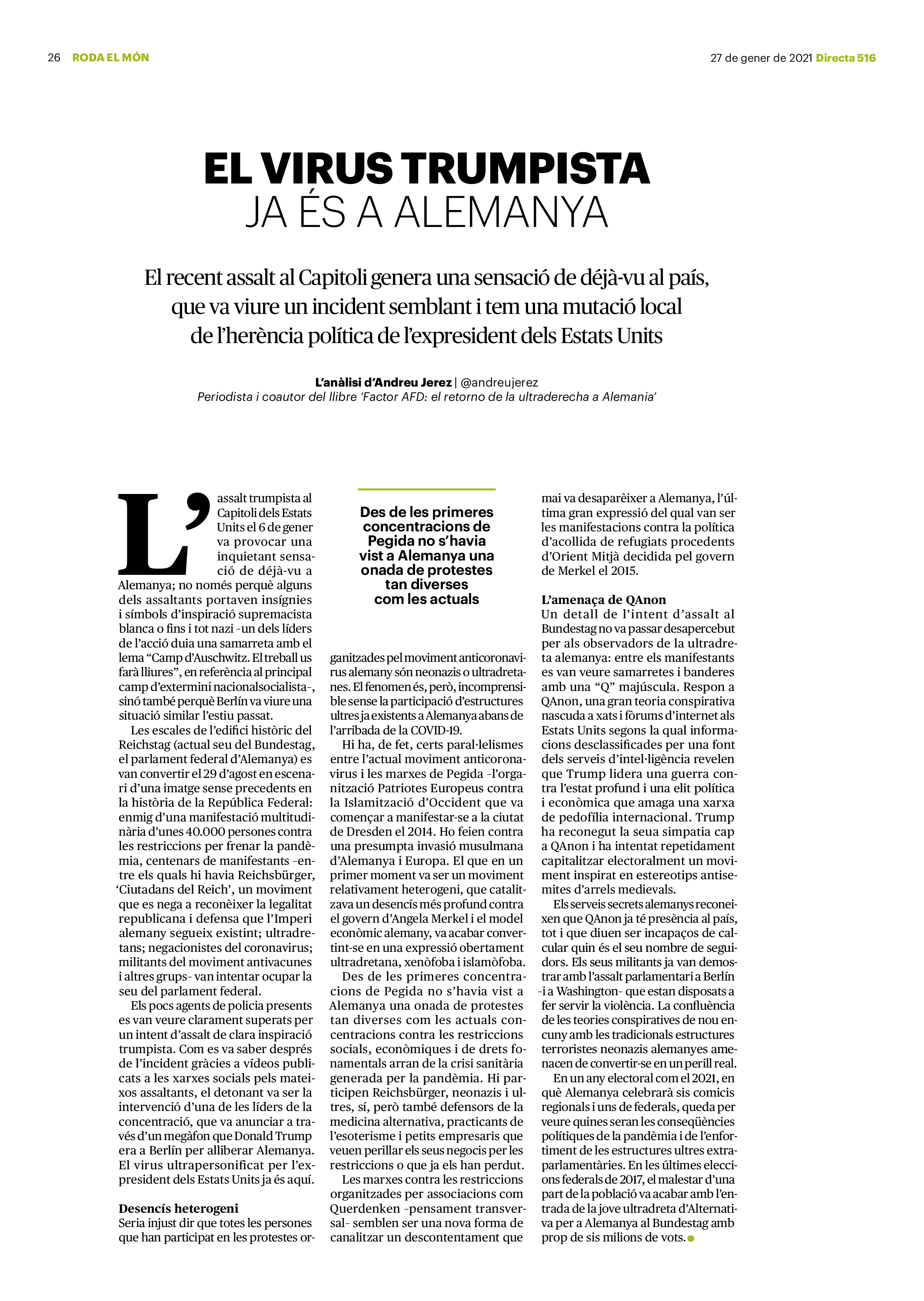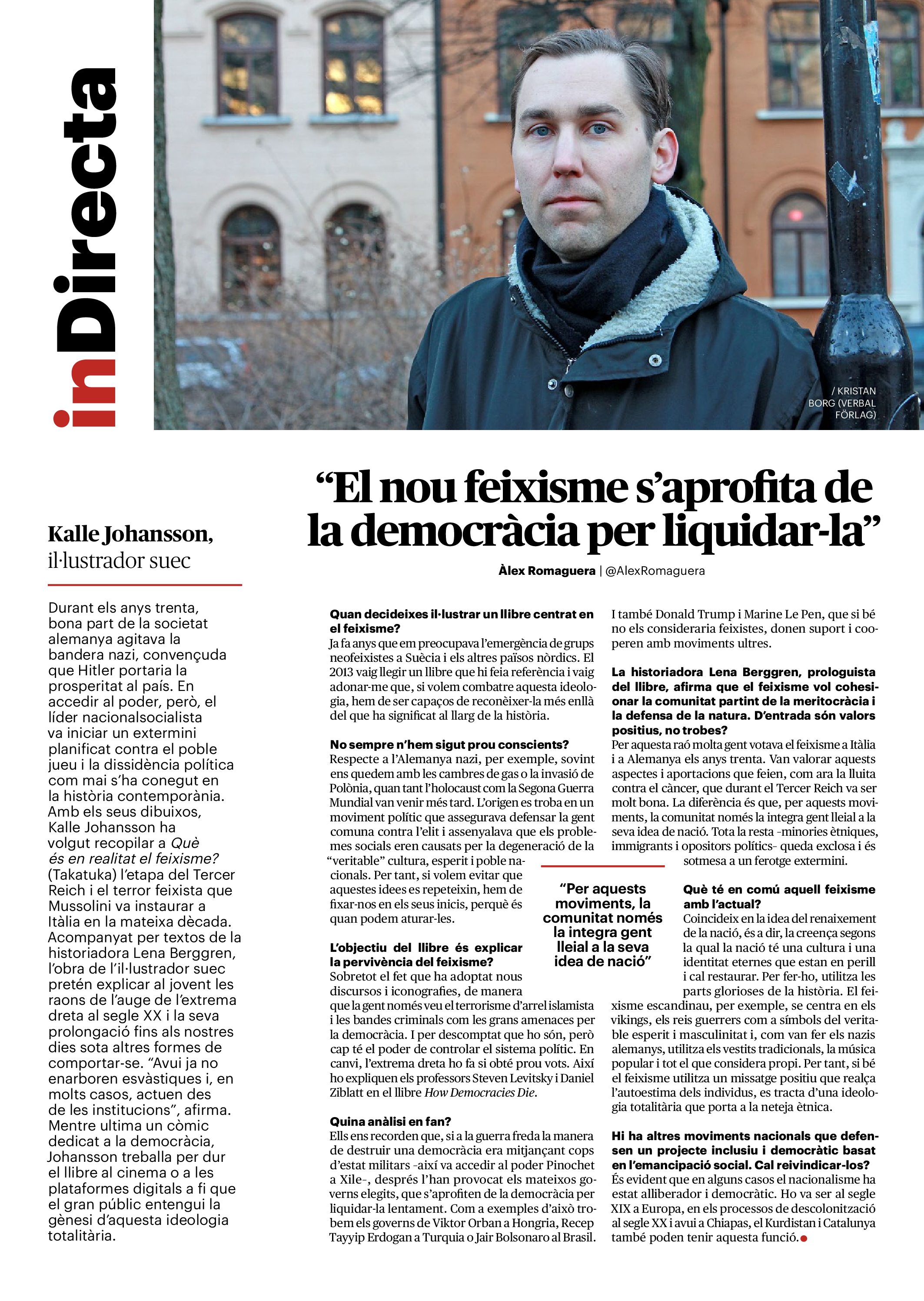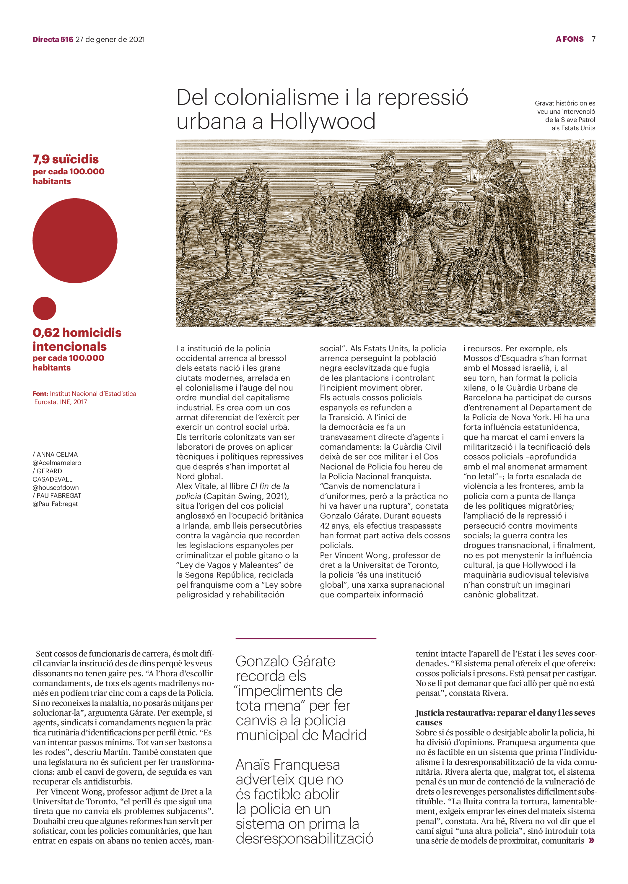 'Directa 516' Pantalla completa Descarregar 1 2-3 4-5 6-7 8-9 10-11 12-13 14-15 16-17 18-19 20-21 22-23 24-25 26-27 28-29 30-31 Consulta el resum del número 516 Què hi trobem, a la 'Directa' 516? A fons A Fons La policia, al punt de mira Anna Celma Imatges | Arxiu A Fons Pobles que avantposen la reparació al càstig Anna Celma Imatges | Arxiu Crüilla Cruïlla La memòria de la fruita Ester Fayos Imatges | Arxiu Expressions Expressions Trenta anys inoculant idees lliures Guille Larios Imatges | Arxiu Expressions Un febrer del XXI Xavier Pijoan Imatges | Isabel Couchoud Bataller Expressions ‘La Veneno’ descansa, però Cristina viu Sara Borrella Expressions El trobador incombustible Ferran Riera Expressions Els orígens supremacistes del feixisme Xavier Díez Miralls Miralls "La profunditat del discurs és obligatòria perquè no podem enfosquir més el món" Xavi Bosch Imatges | Xavi Bosch Roda el mon Roda el món Un conflicte lluny del blanc i el negre Sarah Al-Areqi Imatges | Arxiu Roda el món Xile escriurà la primera Constitució paritària del món Meritxell Freixas Imatges | Elena Bulet Roda el món El virus trumpista ja és a Alemanya Andreu Jerez Imatges | Arxiu Indirecta Indirecta “El nou feixisme s’aprofita de la democràcia per liquidar-la” Àlex Romaguera Imatges | Arxiu Impressions Impressions El llarg camí per la igualtat laboral Beatriu Cardona i Prats Imatges | EMEA Impressions La vacuna de la 'normalitat' Joan Sala Coromina Imatges | Sara Jansen Donacions Fes una donació 5€ 10€ 20€ 50€ + FES UN DONATIU