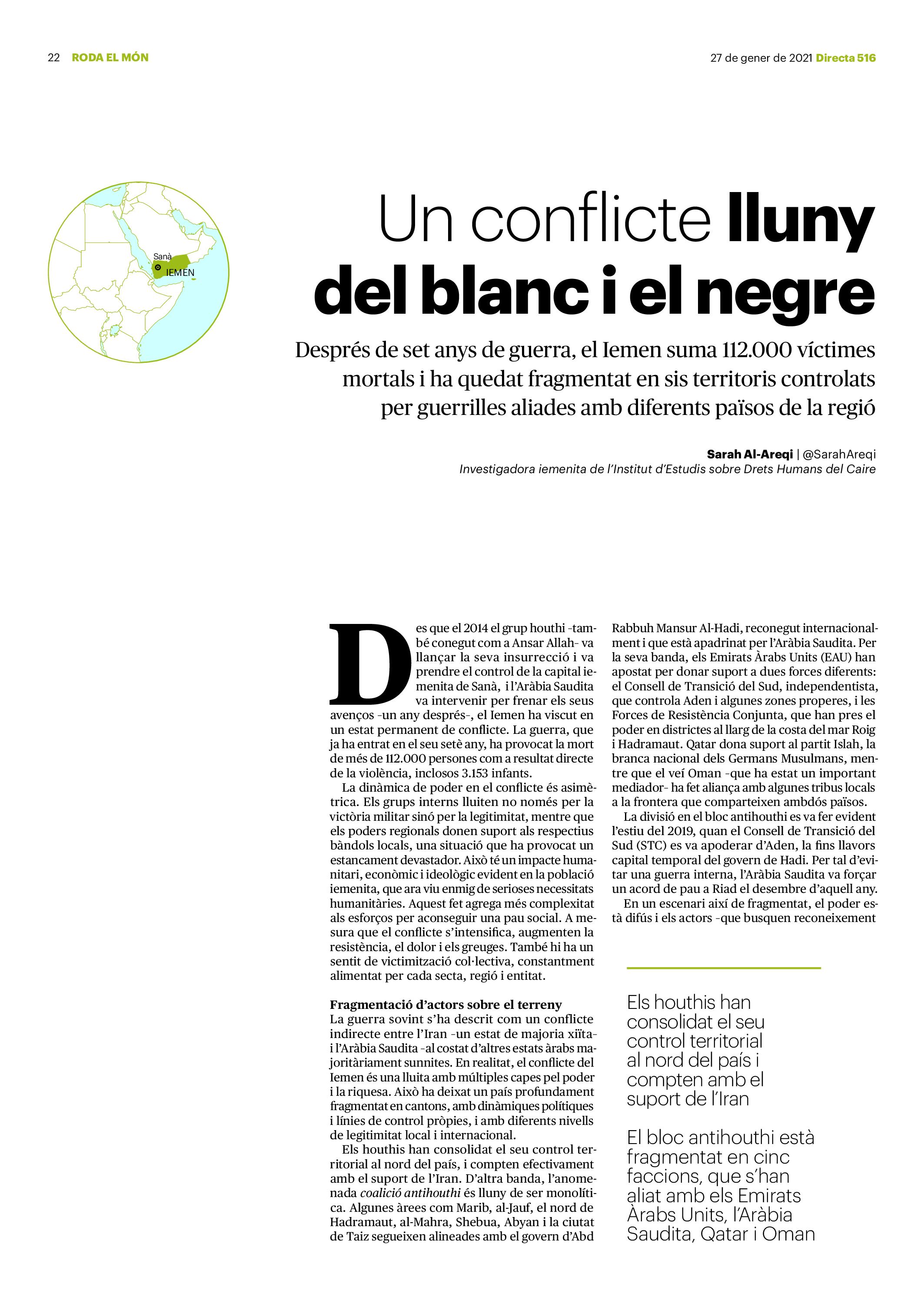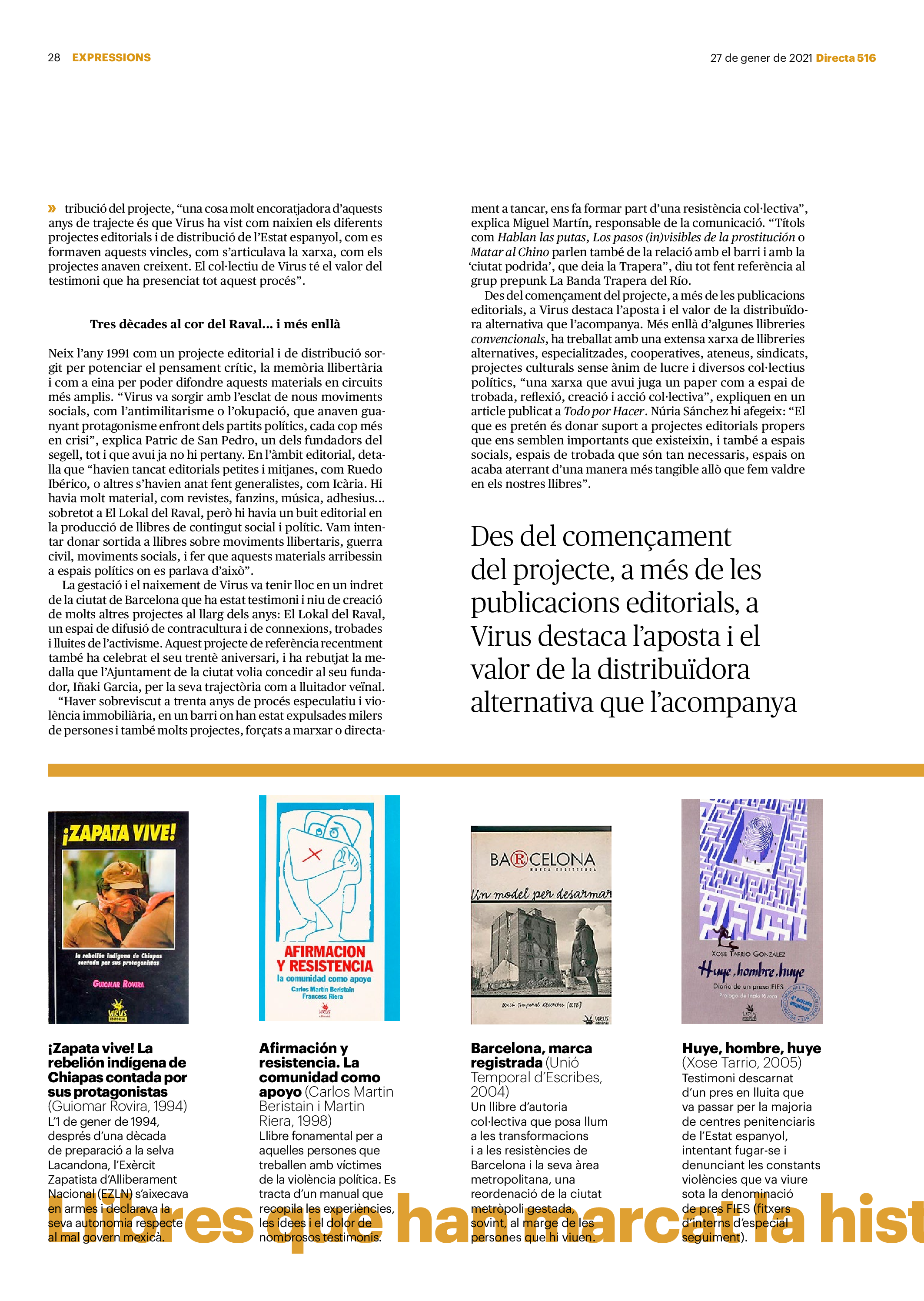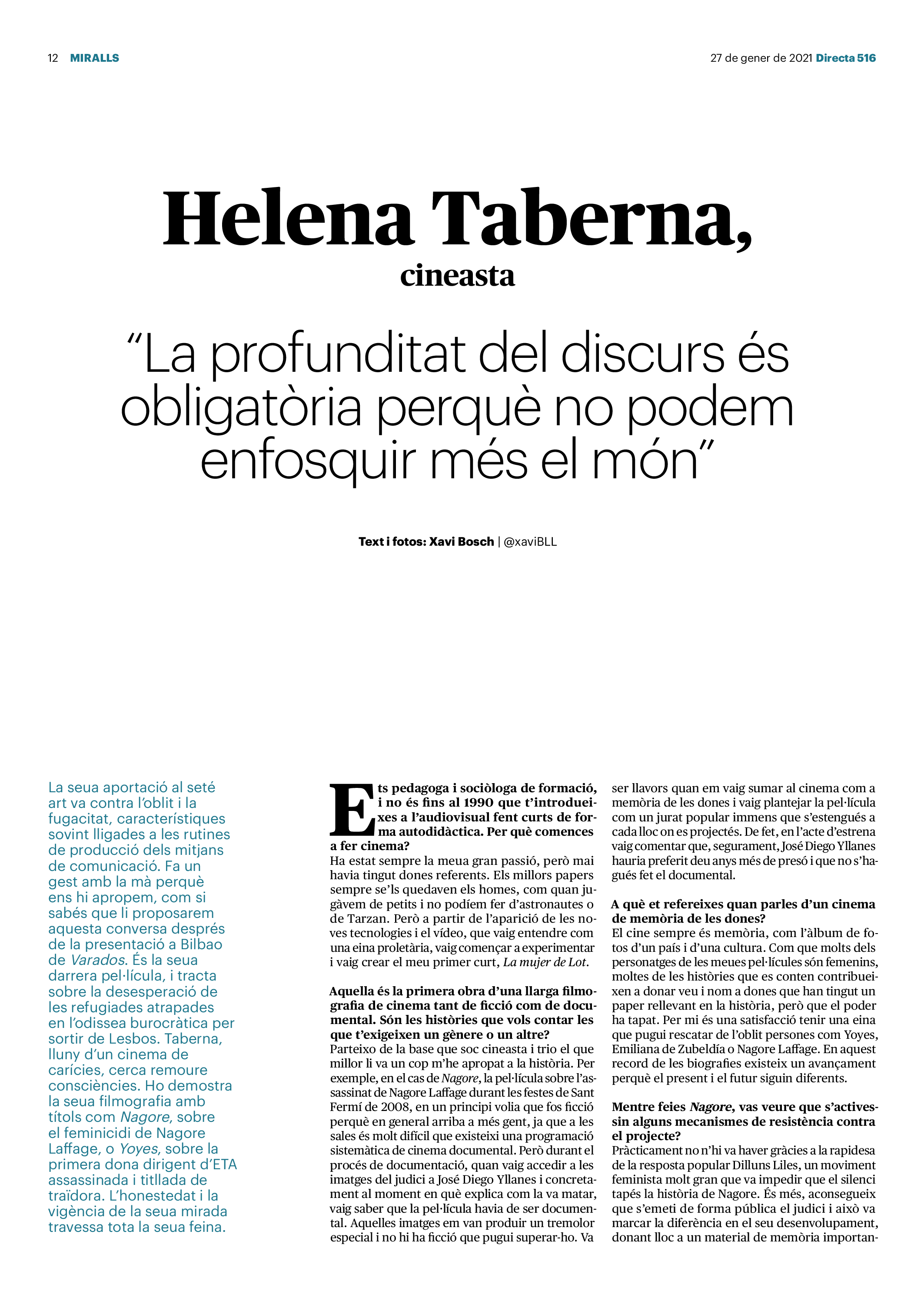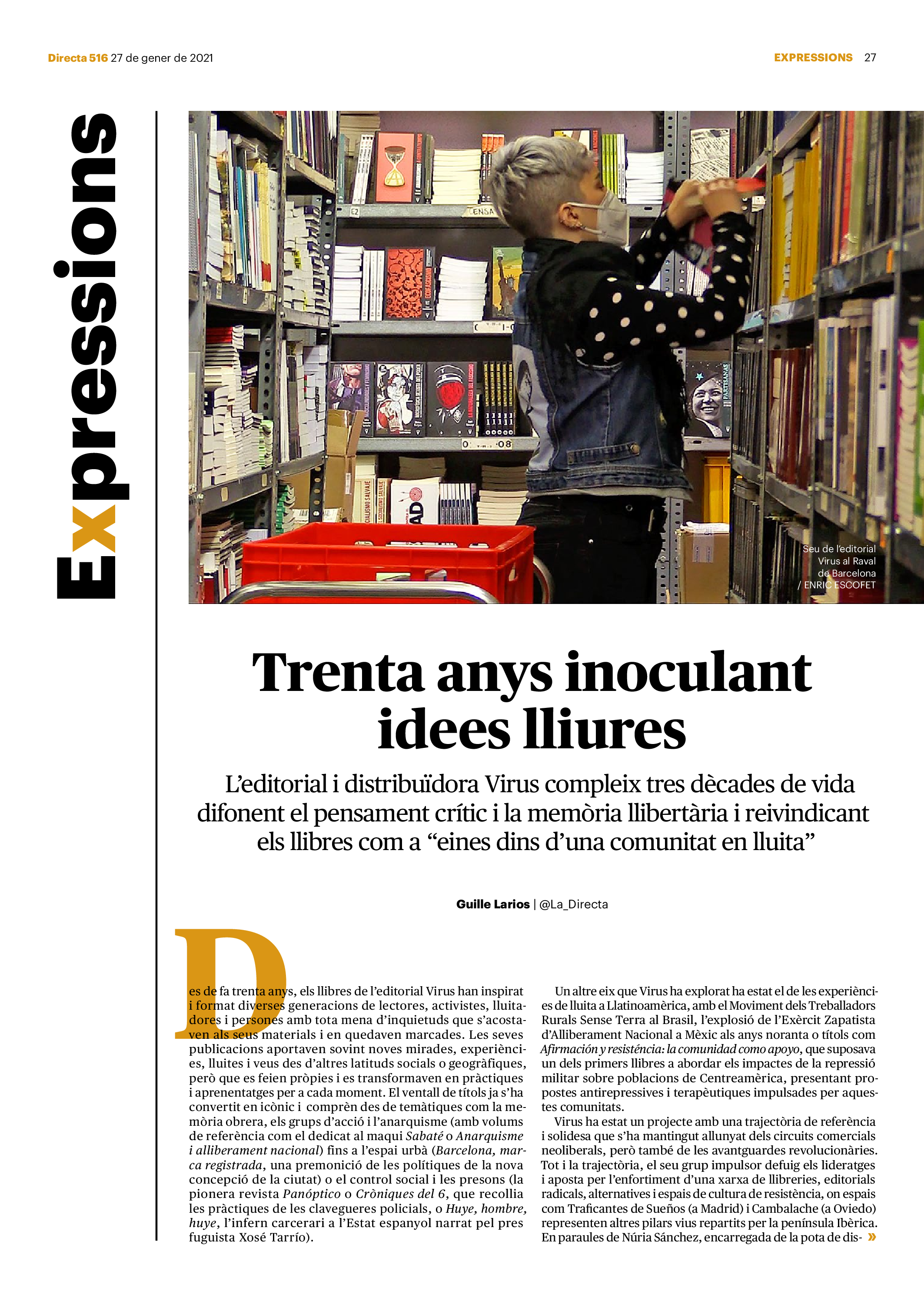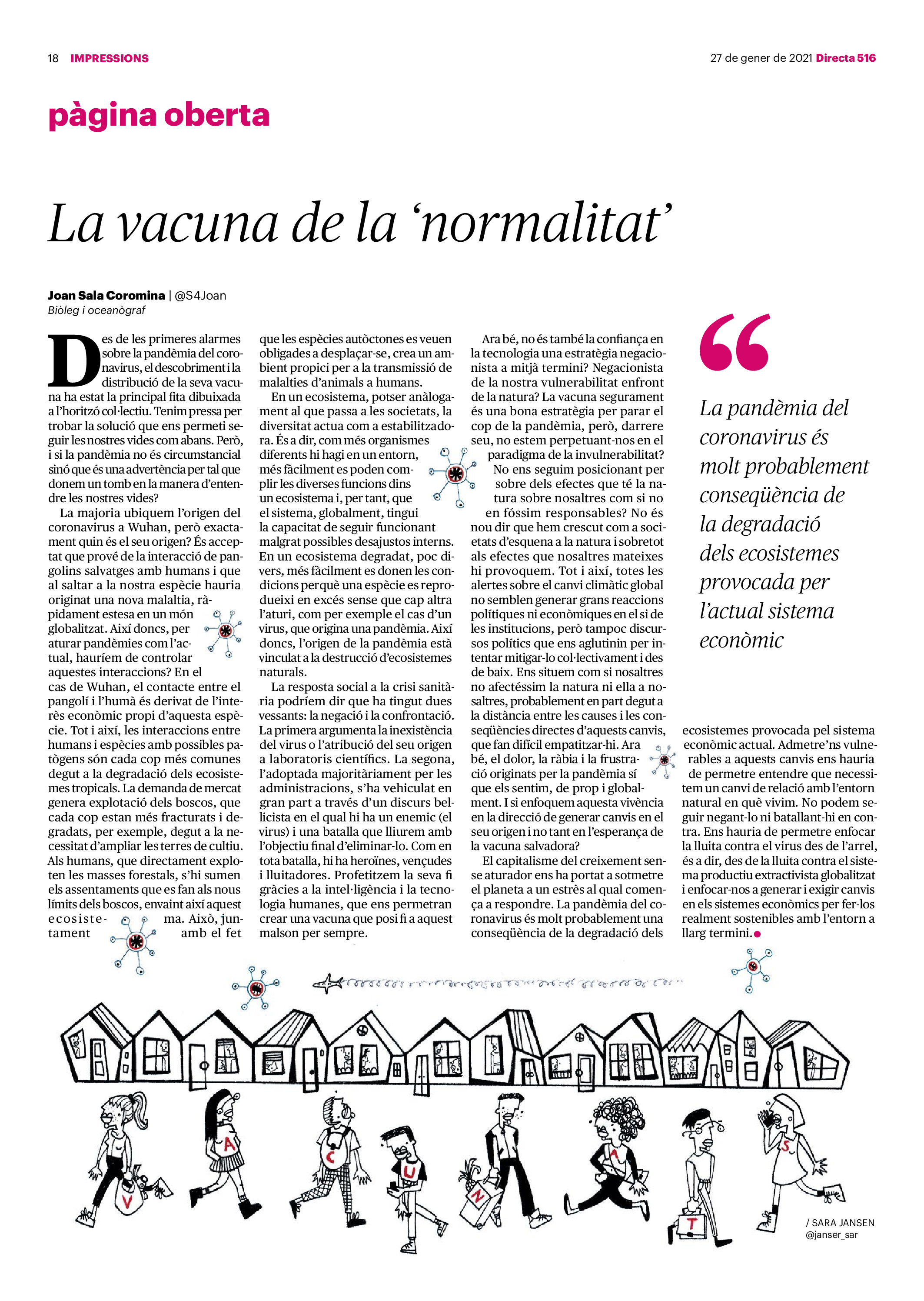 'Directa 516' Pantalla completa Descarregar 1 2-3 4-5 6-7 8-9 10-11 12-13 14-15 16-17 18-19 20-21 22-23 24-25 26-27 28-29 30-31 Consulta el resum del número 516 Què hi trobem, a la 'Directa' 516? A fons A Fons La policia, al punt de mira Anna Celma Imatges | Arxiu A Fons Pobles que avantposen la reparació al càstig Anna Celma Imatges | Arxiu Crüilla Cruïlla La memòria de la fruita Ester Fayos Imatges | Arxiu Expressions Expressions Trenta anys inoculant idees lliures Guille Larios Imatges | Arxiu Expressions Un febrer del XXI Xavier Pijoan Imatges | Isabel Couchoud Bataller Expressions ‘La Veneno’ descansa, però Cristina viu Sara Borrella Expressions El trobador incombustible Ferran Riera Expressions Els orígens supremacistes del feixisme Xavier Díez Miralls Miralls "La profunditat del discurs és obligatòria perquè no podem enfosquir més el món" Xavi Bosch Imatges | Xavi Bosch Roda el mon Roda el món Un conflicte lluny del blanc i el negre Sarah Al-Areqi Imatges | Arxiu Roda el món Xile escriurà la primera Constitució paritària del món Meritxell Freixas Imatges | Elena Bulet Roda el món El virus trumpista ja és a Alemanya Andreu Jerez Imatges | Arxiu Indirecta Indirecta “El nou feixisme s’aprofita de la democràcia per liquidar-la” Àlex Romaguera Imatges | Arxiu Impressions Impressions El llarg camí per la igualtat laboral Beatriu Cardona i Prats Imatges | EMEA Impressions La vacuna de la 'normalitat' Joan Sala Coromina Imatges | Sara Jansen Donacions Fes una donació 5€ 10€ 20€ 50€ + FES UN DONATIU