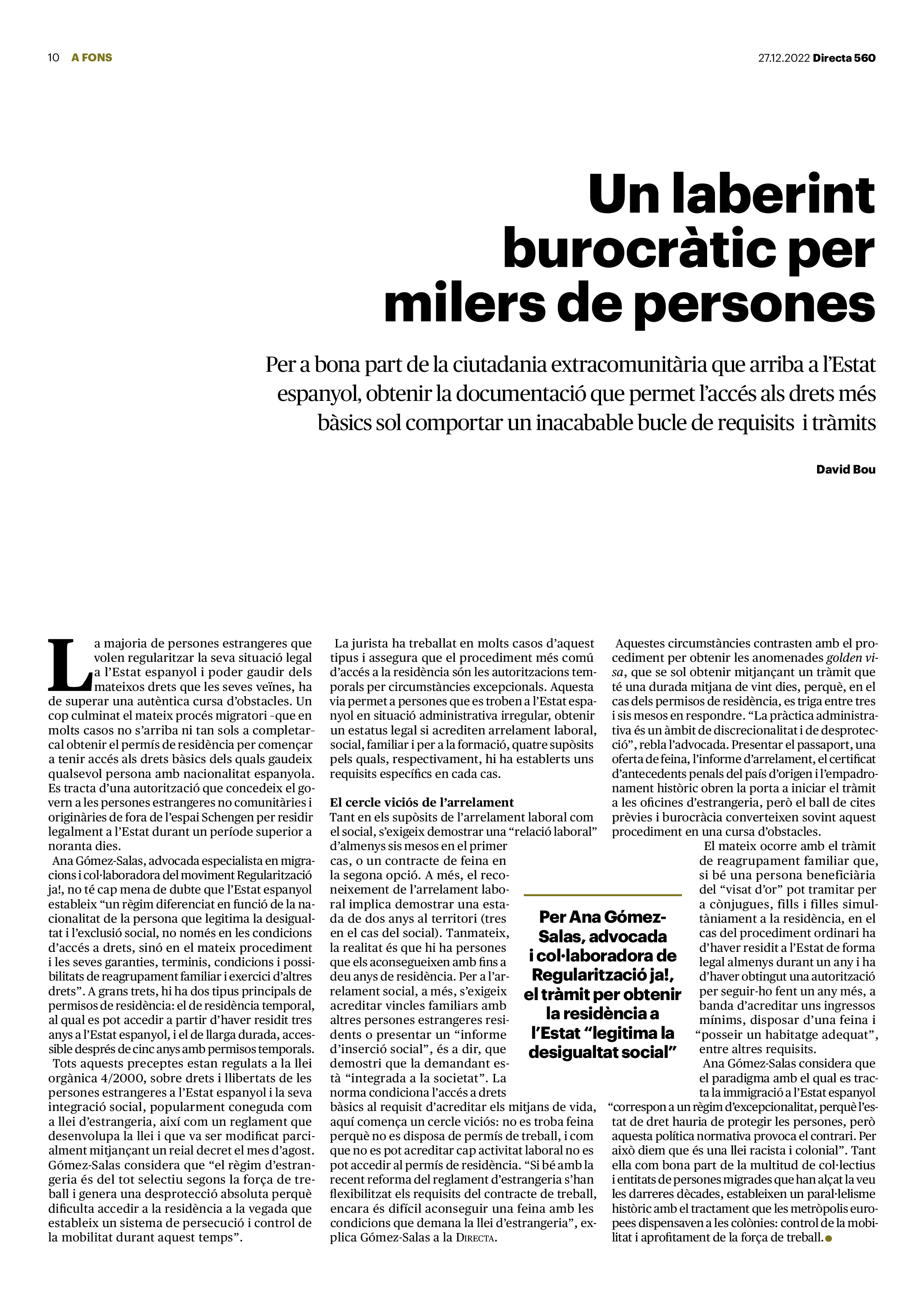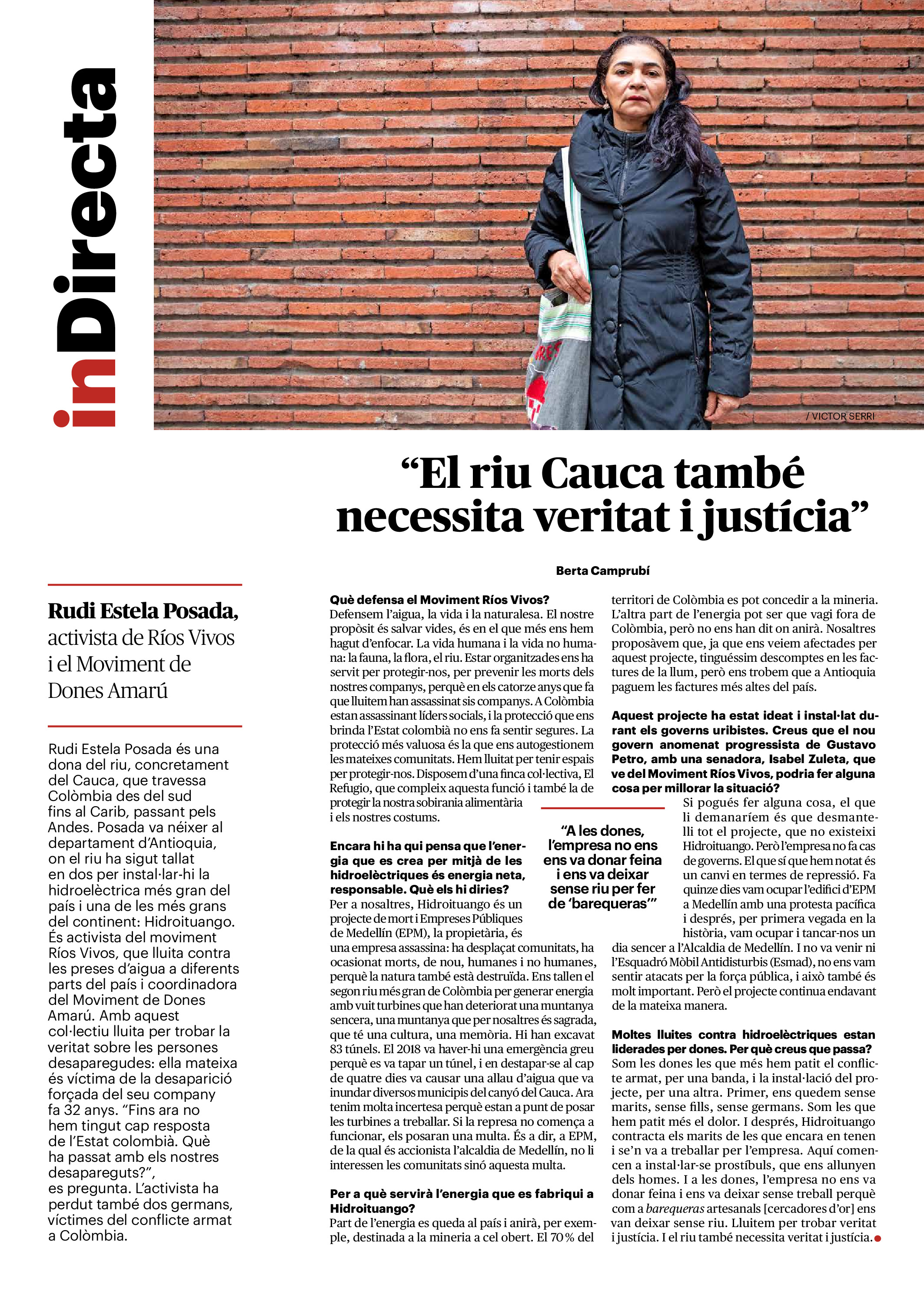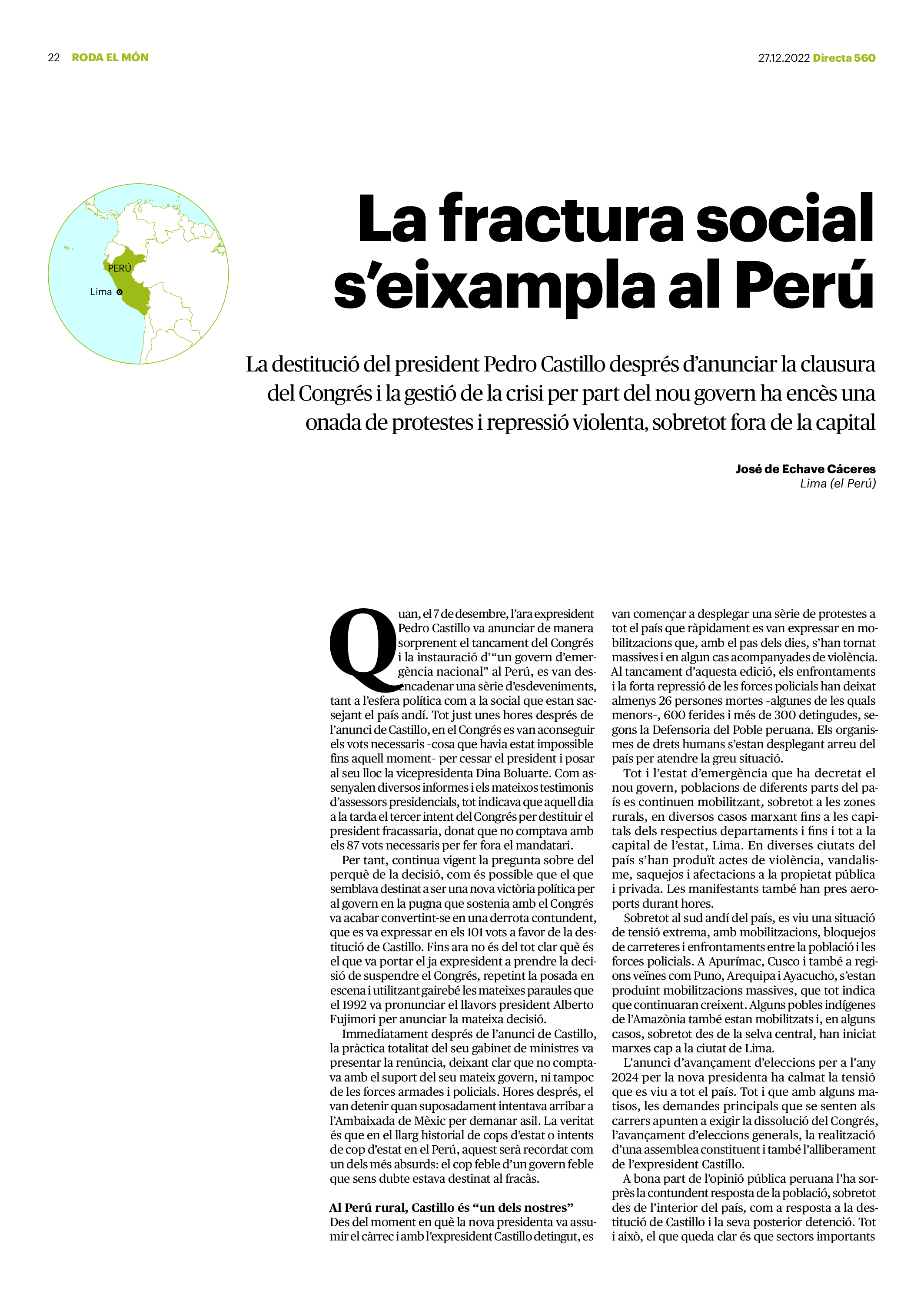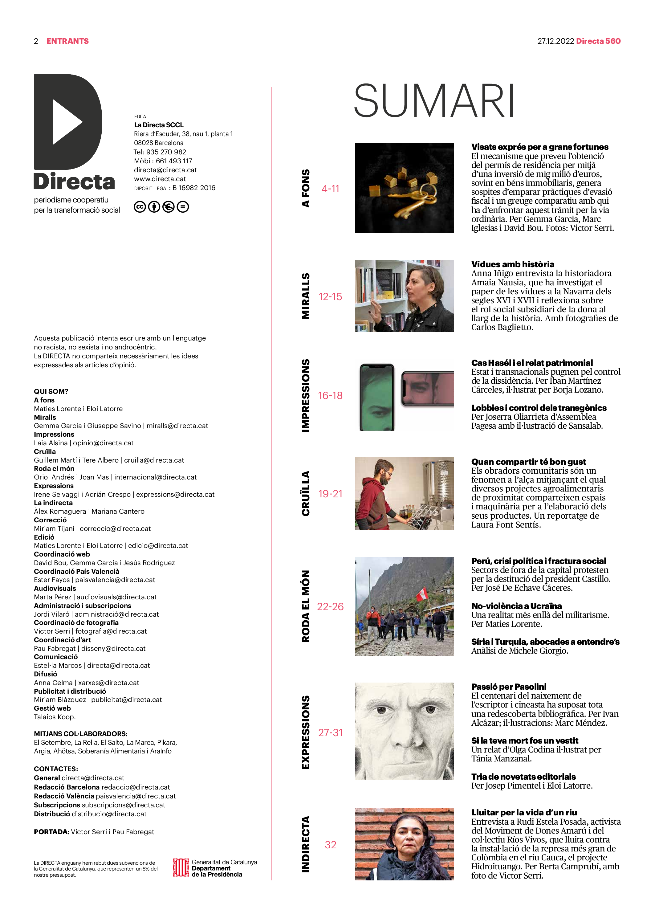 'Directa 560' Pantalla completa Descarregar 1 2-3 4-5 6-7 8-9 10-11 12-13 14-15 16-17 18-19 20-21 22-23 24-25 26-27 28-29 30-31 Consulta el resum del número 560 Què hi trobem, a la ‘Directa’ 560? A fons A Fons Permís de residència exprés per a les grans fortunes Gemma Garcia Imatges | Victor Serri A Fons Portugal, escàndols de corrupció i un fre limitat Marc Iglesias Imatges | Arxiu A Fons Un laberint burocràtic per milers de persones David Bou Imatges | Victor Serri Crüilla Cruïlla Sabors compartits Laura Font Sentís Imatges | Claudia Clavell Expressions Expressions Pasolini, més modern que cap modern Ivan Alcázar Serrat Imatges | Marc Méndez Expressions Si la teva mort fos un vestit Olga Codina Imatges | Tània Manzanal Cerdà Expressions Utopia llibertària als marges de l’Imperi romà Josep Pimentel Expressions Una de pirates i altres dissidències contra el poder colonial Eloi Latorre Miralls Miralls “La falsa idea de ‘progrés’ històric queda per a l’home heterosexual, blanc i ric” Anna Iñigo Imatges | Carlos Baglietto Roda el mon Roda el món La fractura social s’eixampla al Perú José de Echave Cáceres Imatges | Arxiu Roda el món La no-violència, víctima de la guerra a Ucraïna Maties Lorente Imatges | Roman Baluk Roda el món Cimera Al-Assad i Erdogan: no, però sí Michele Giorgio Imatges | Arxiu Indirecta Indirecta “El riu Cauca també necessita veritat i justícia” Berta Camprubí Imatges | Victor Serri Impressions Impressions El cas de Pablo Hasél o la disputa pel control del relat patrimonial Ibán Martínez Cárceles Imatges | Borja Lozano Impressions Lobbies manipuladors amb el control dels transgènics Joserra Olarieta Imatges | SANSAlab Donacions Fes una donació 5€ 10€ 20€ 50€ + FES UN DONATIU