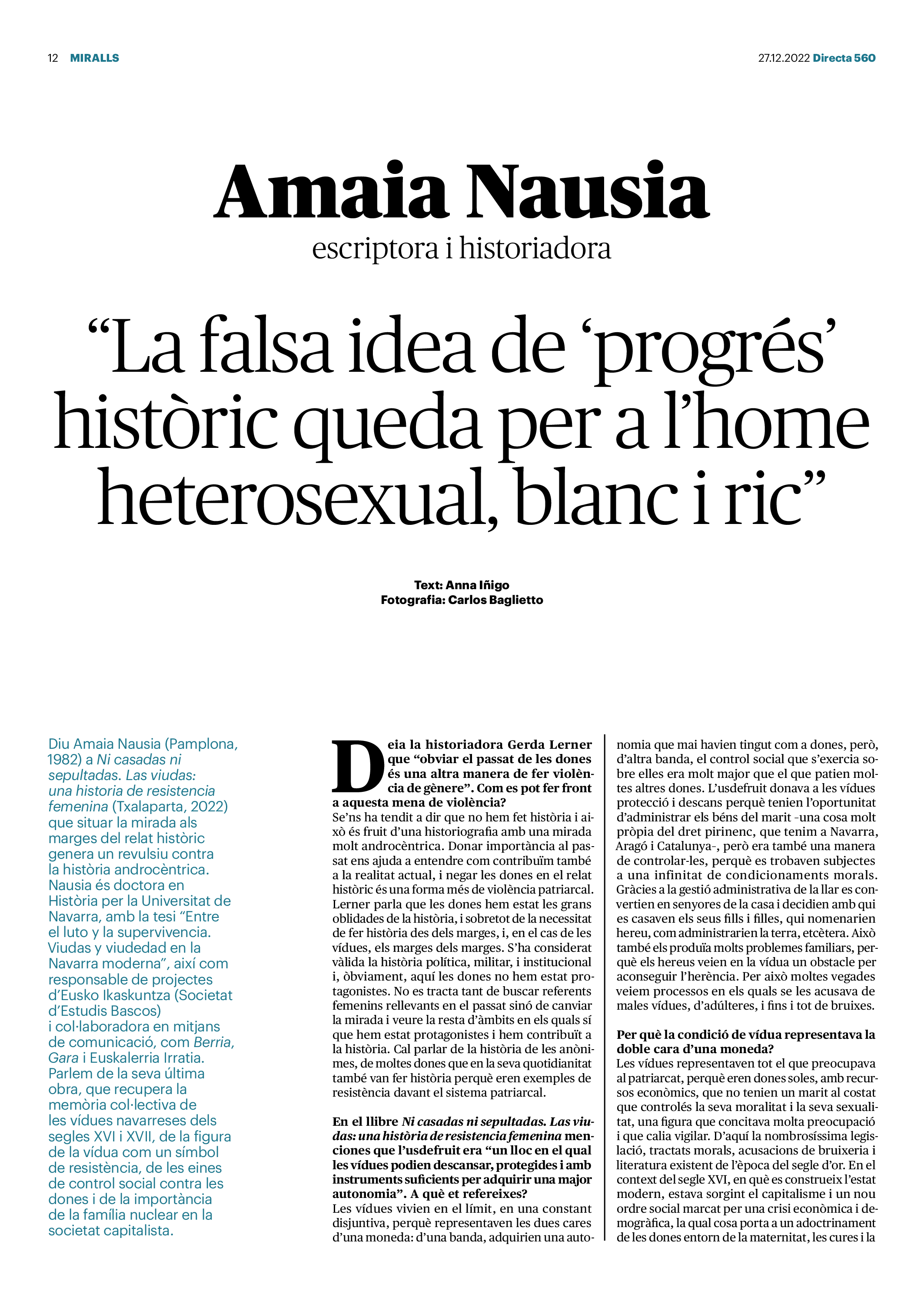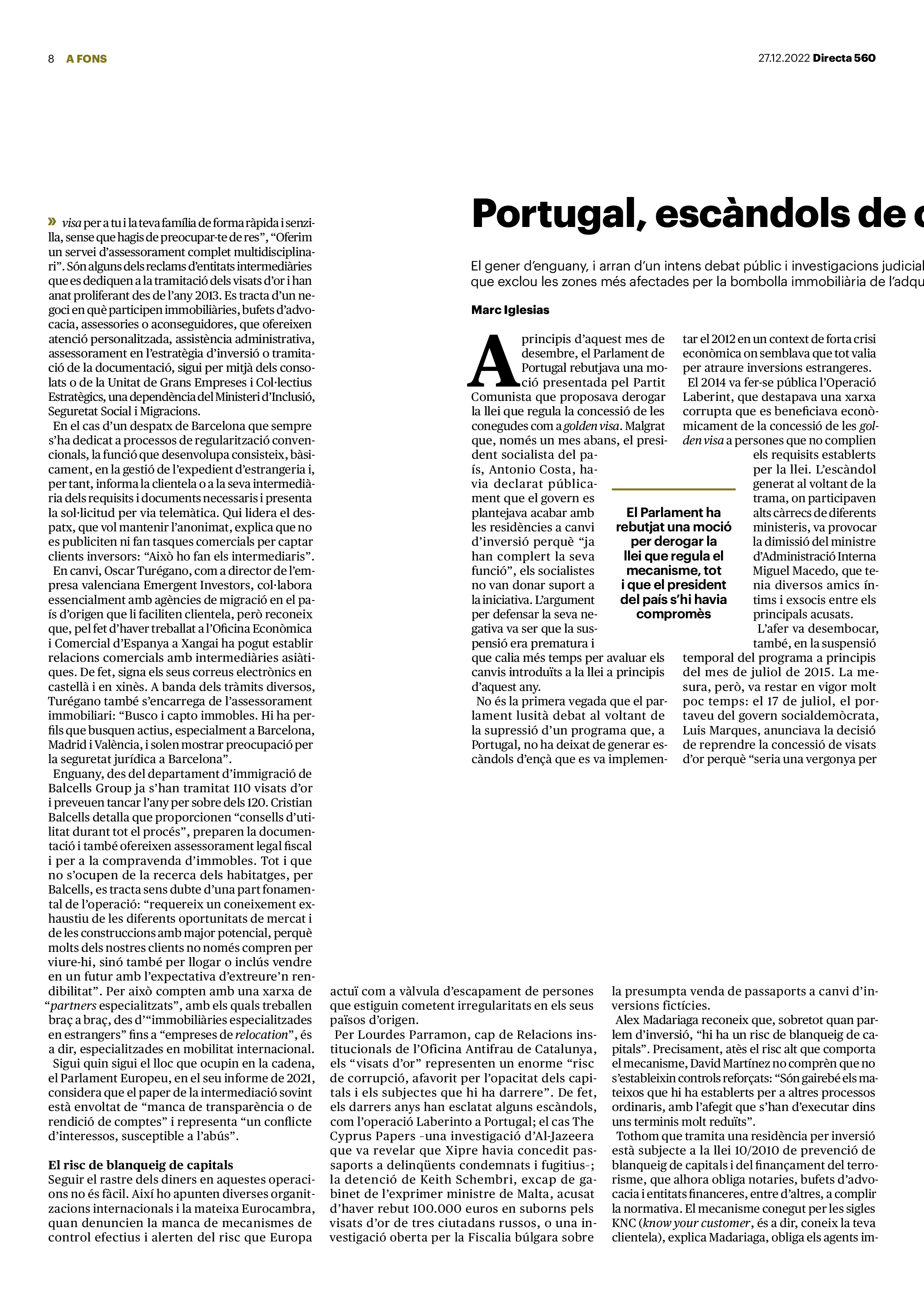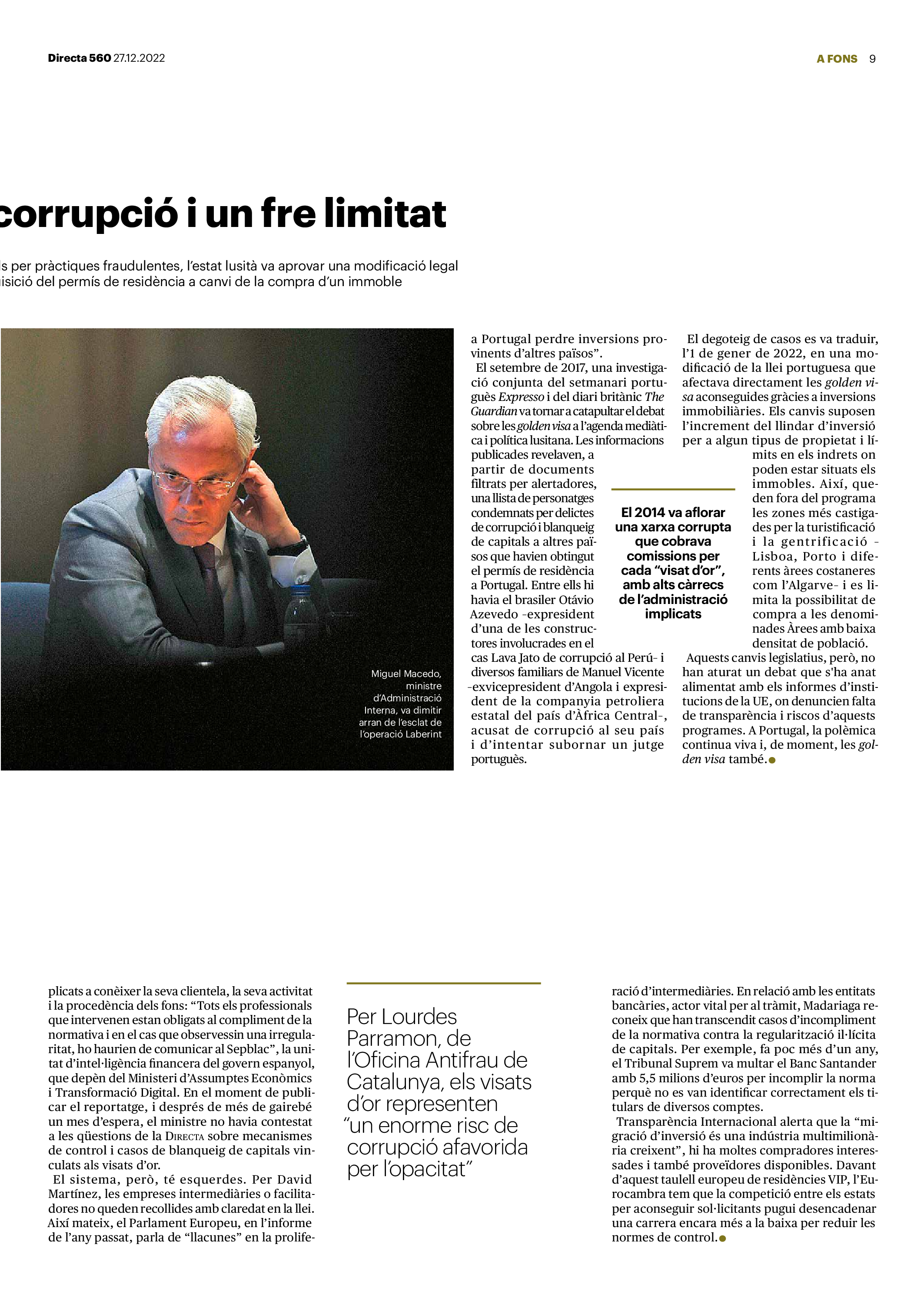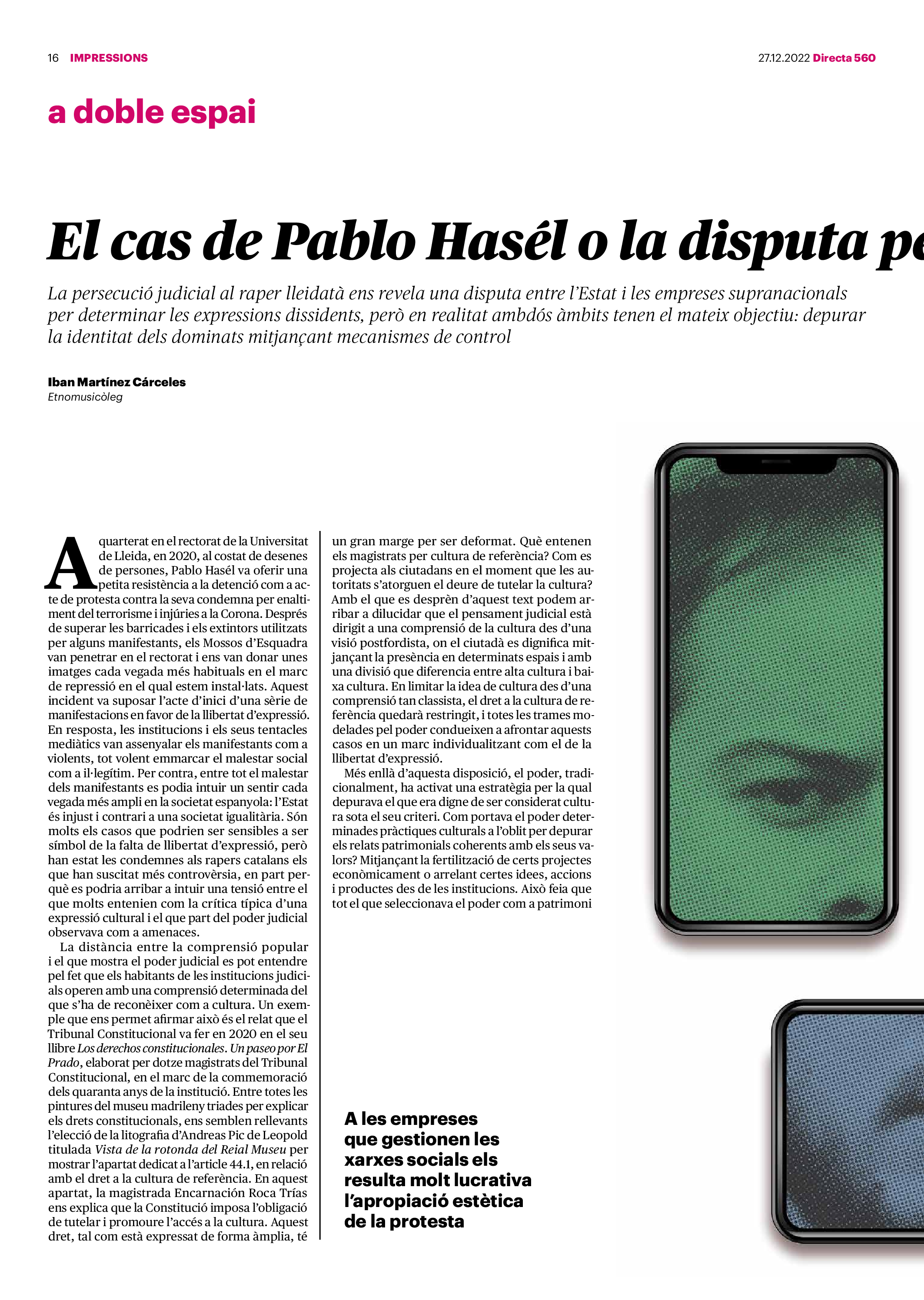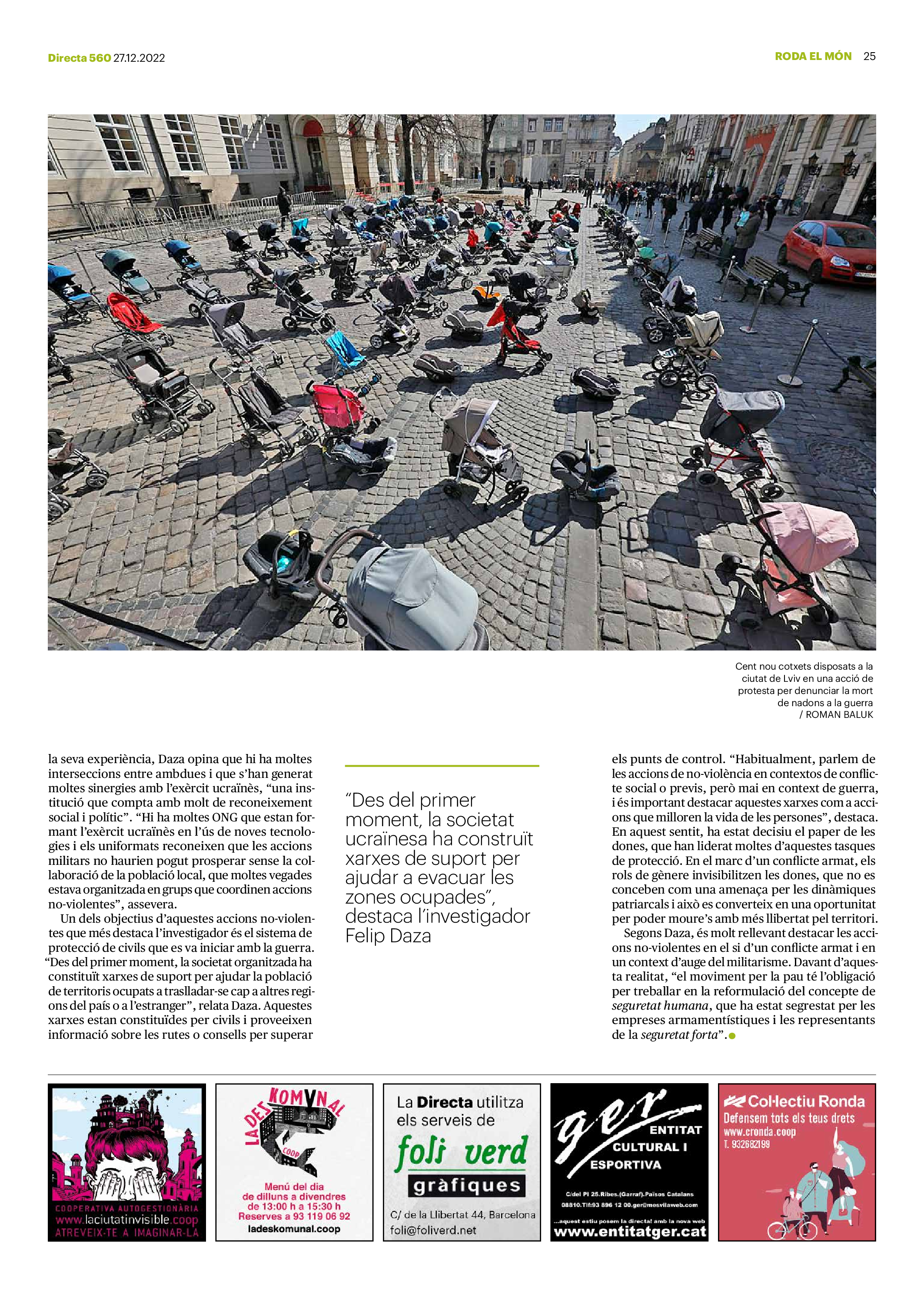 'Directa 560' Pantalla completa Descarregar 1 2-3 4-5 6-7 8-9 10-11 12-13 14-15 16-17 18-19 20-21 22-23 24-25 26-27 28-29 30-31 Consulta el resum del número 560 Què hi trobem, a la ‘Directa’ 560? A fons A Fons Permís de residència exprés per a les grans fortunes Gemma Garcia Imatges | Victor Serri A Fons Portugal, escàndols de corrupció i un fre limitat Marc Iglesias Imatges | Arxiu A Fons Un laberint burocràtic per milers de persones David Bou Imatges | Victor Serri Crüilla Cruïlla Sabors compartits Laura Font Sentís Imatges | Claudia Clavell Expressions Expressions Pasolini, més modern que cap modern Ivan Alcázar Serrat Imatges | Marc Méndez Expressions Si la teva mort fos un vestit Olga Codina Imatges | Tània Manzanal Cerdà Expressions Utopia llibertària als marges de l’Imperi romà Josep Pimentel Expressions Una de pirates i altres dissidències contra el poder colonial Eloi Latorre Miralls Miralls “La falsa idea de ‘progrés’ històric queda per a l’home heterosexual, blanc i ric” Anna Iñigo Imatges | Carlos Baglietto Roda el mon Roda el món La fractura social s’eixampla al Perú José de Echave Cáceres Imatges | Arxiu Roda el món La no-violència, víctima de la guerra a Ucraïna Maties Lorente Imatges | Roman Baluk Roda el món Cimera Al-Assad i Erdogan: no, però sí Michele Giorgio Imatges | Arxiu Indirecta Indirecta “El riu Cauca també necessita veritat i justícia” Berta Camprubí Imatges | Victor Serri Impressions Impressions El cas de Pablo Hasél o la disputa pel control del relat patrimonial Ibán Martínez Cárceles Imatges | Borja Lozano Impressions Lobbies manipuladors amb el control dels transgènics Joserra Olarieta Imatges | SANSAlab Donacions Fes una donació 5€ 10€ 20€ 50€ + FES UN DONATIU