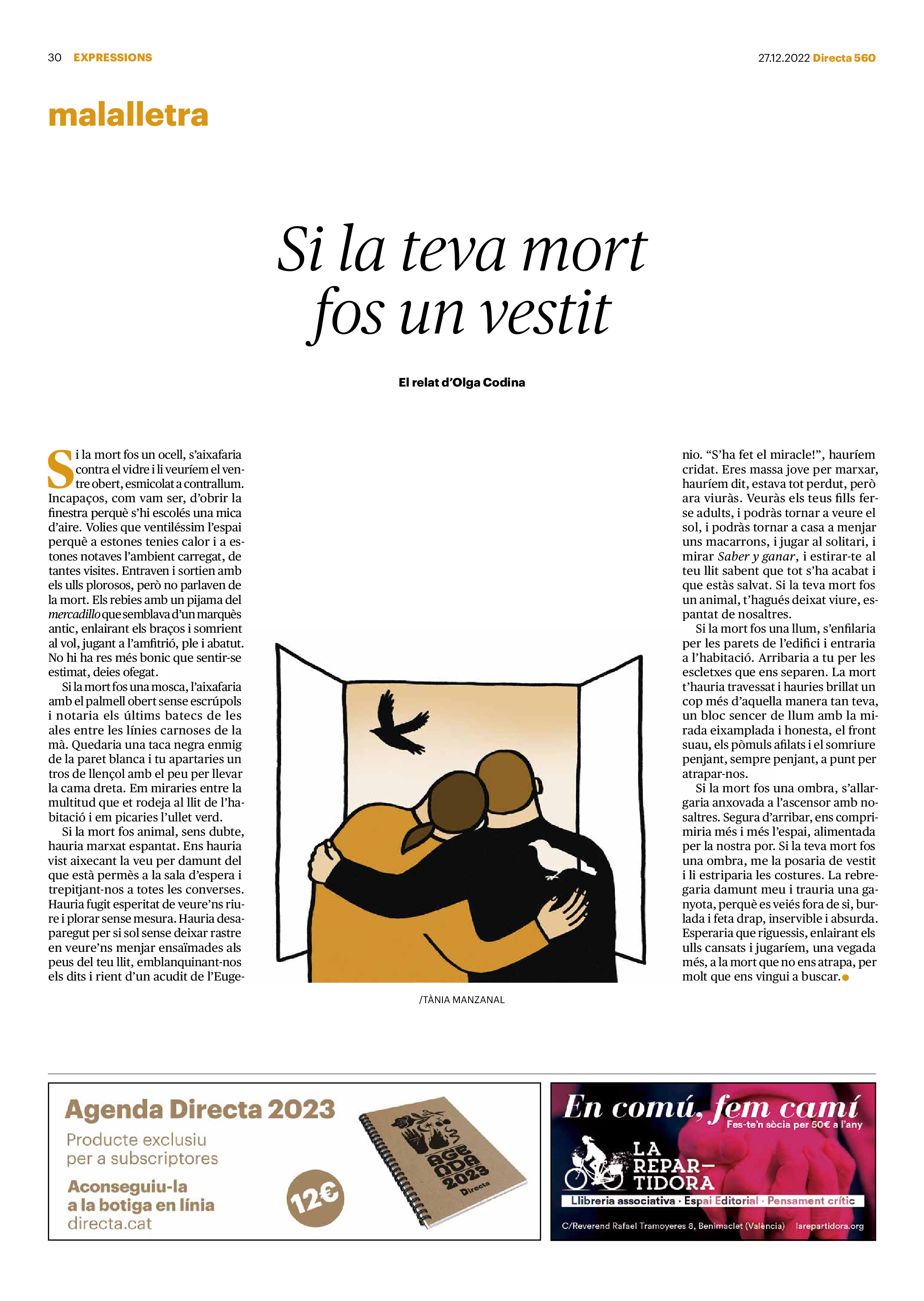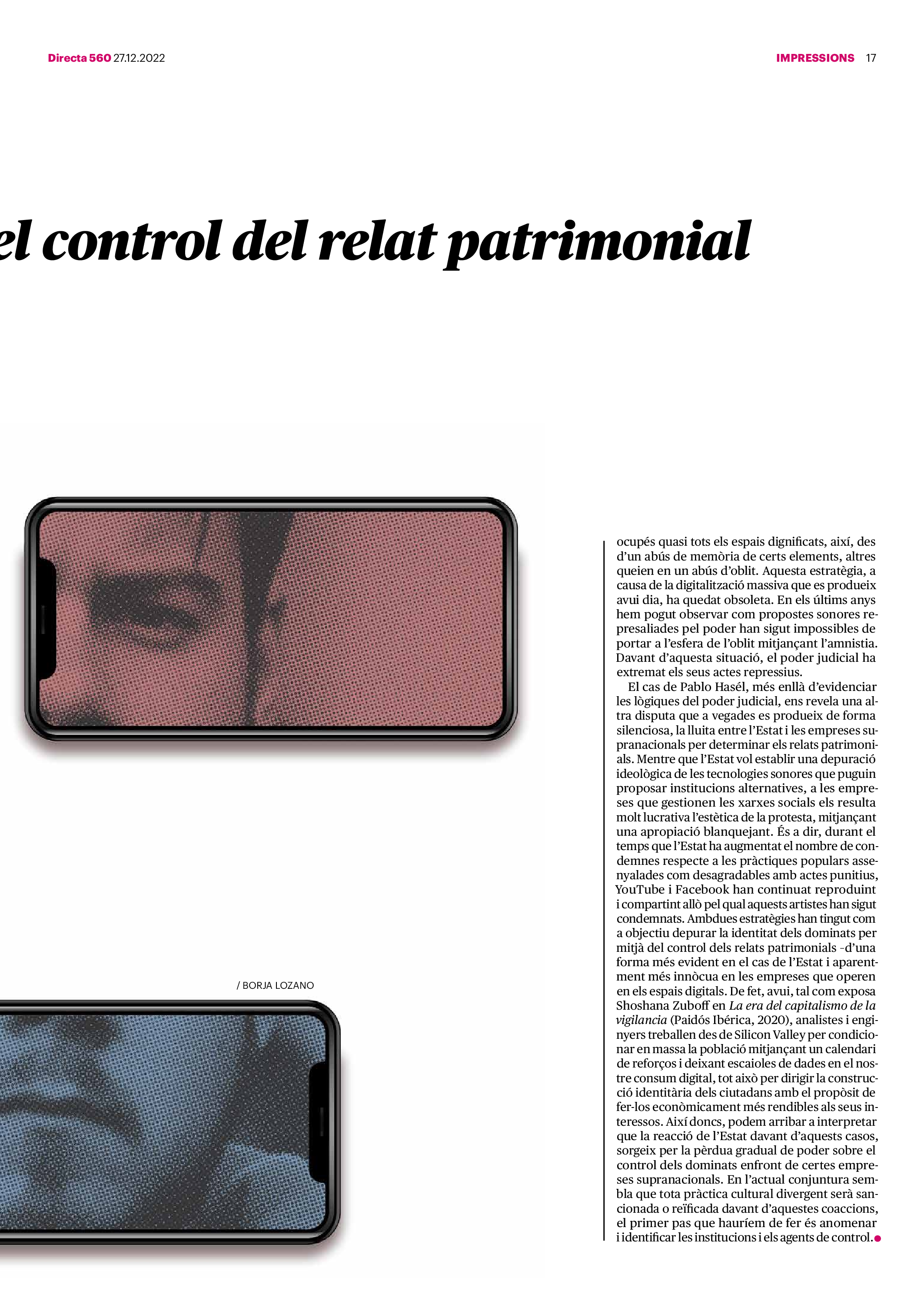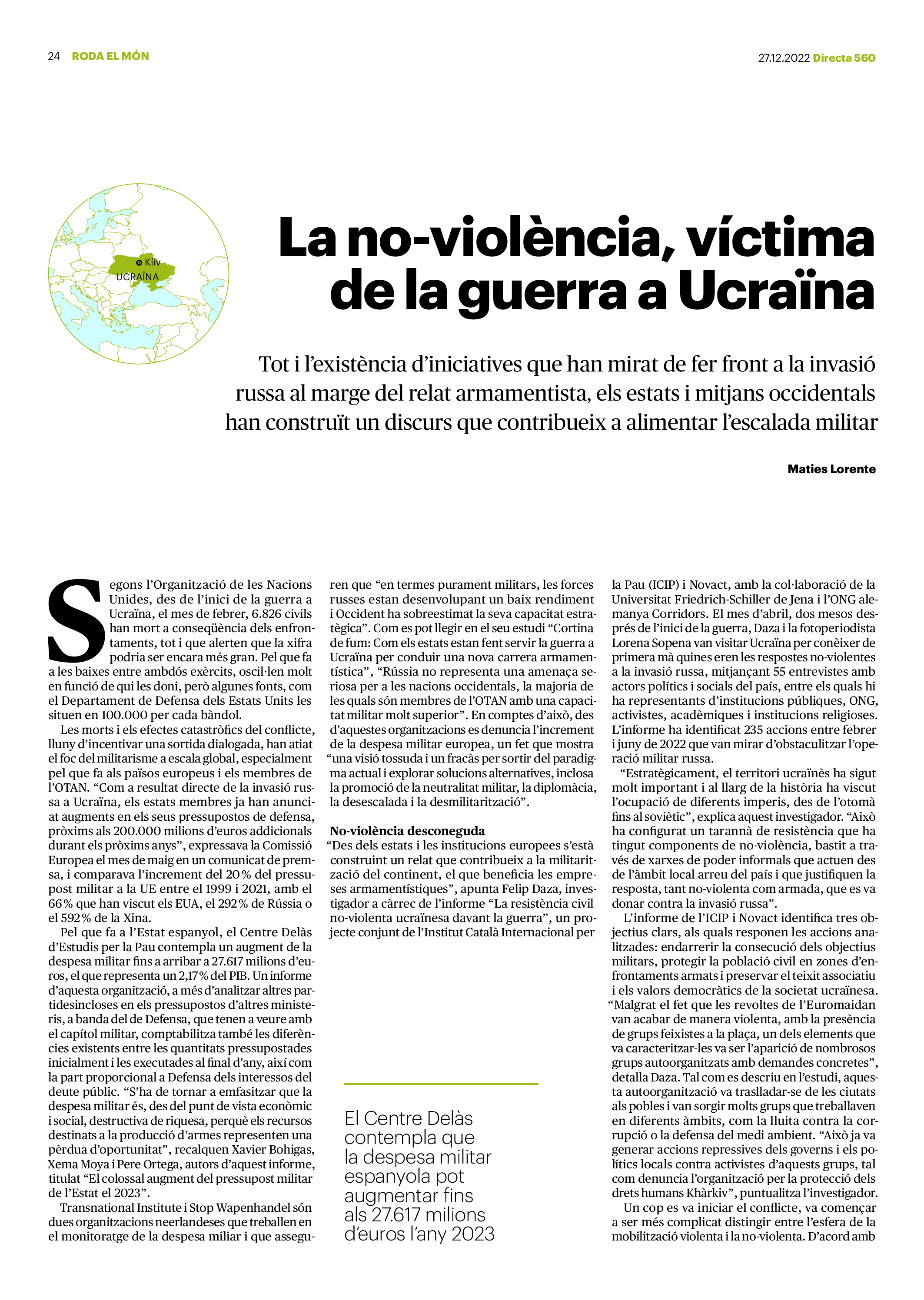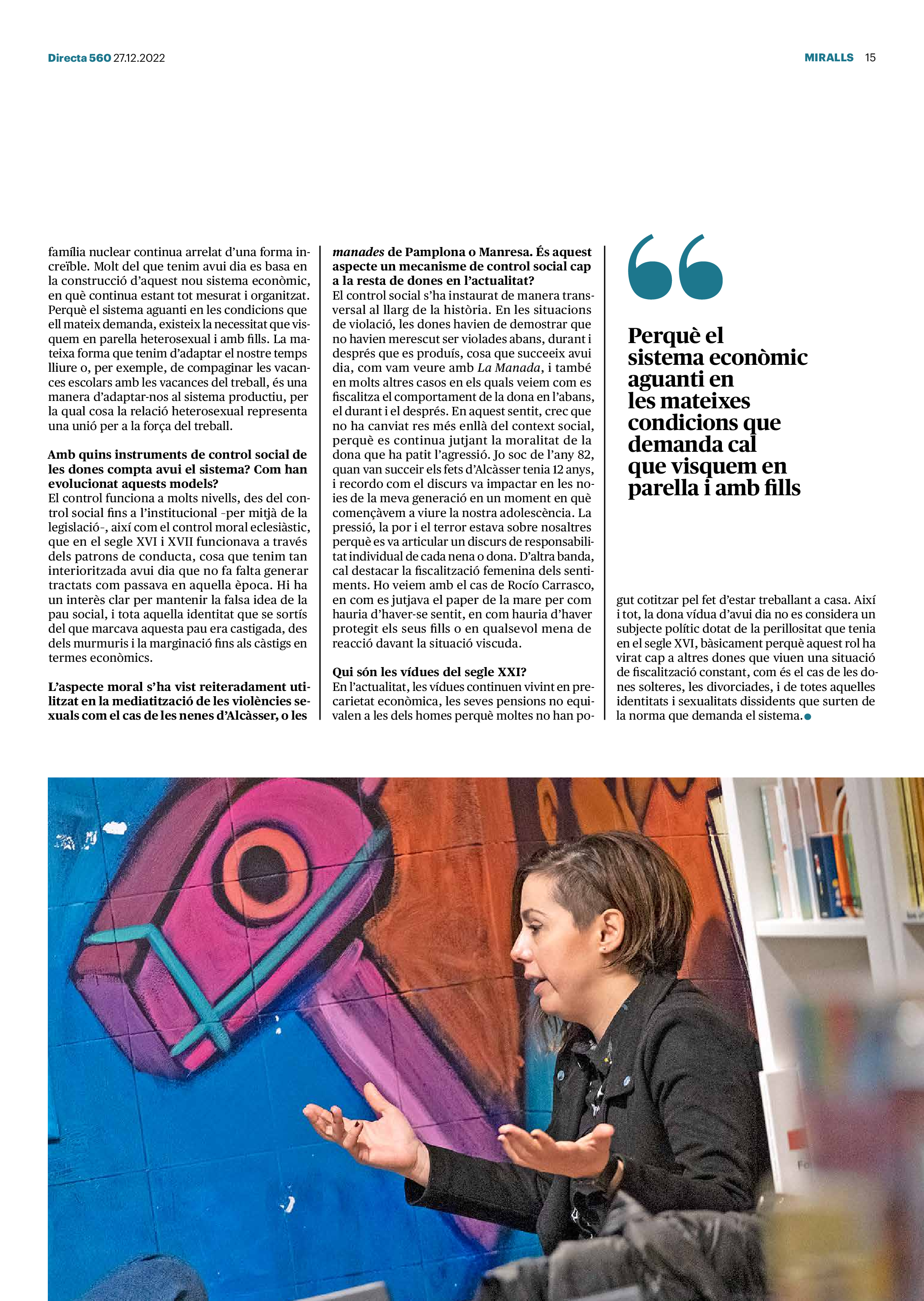 'Directa 560' Pantalla completa Descarregar 1 2-3 4-5 6-7 8-9 10-11 12-13 14-15 16-17 18-19 20-21 22-23 24-25 26-27 28-29 30-31 Consulta el resum del número 560 Què hi trobem, a la ‘Directa’ 560? A fons A Fons Permís de residència exprés per a les grans fortunes Gemma Garcia Imatges | Victor Serri A Fons Portugal, escàndols de corrupció i un fre limitat Marc Iglesias Imatges | Arxiu A Fons Un laberint burocràtic per milers de persones David Bou Imatges | Victor Serri Crüilla Cruïlla Sabors compartits Laura Font Sentís Imatges | Claudia Clavell Expressions Expressions Pasolini, més modern que cap modern Ivan Alcázar Serrat Imatges | Marc Méndez Expressions Si la teva mort fos un vestit Olga Codina Imatges | Tània Manzanal Cerdà Expressions Utopia llibertària als marges de l’Imperi romà Josep Pimentel Expressions Una de pirates i altres dissidències contra el poder colonial Eloi Latorre Miralls Miralls “La falsa idea de ‘progrés’ històric queda per a l’home heterosexual, blanc i ric” Anna Iñigo Imatges | Carlos Baglietto Roda el mon Roda el món La fractura social s’eixampla al Perú José de Echave Cáceres Imatges | Arxiu Roda el món La no-violència, víctima de la guerra a Ucraïna Maties Lorente Imatges | Roman Baluk Roda el món Cimera Al-Assad i Erdogan: no, però sí Michele Giorgio Imatges | Arxiu Indirecta Indirecta “El riu Cauca també necessita veritat i justícia” Berta Camprubí Imatges | Victor Serri Impressions Impressions El cas de Pablo Hasél o la disputa pel control del relat patrimonial Ibán Martínez Cárceles Imatges | Borja Lozano Impressions Lobbies manipuladors amb el control dels transgènics Joserra Olarieta Imatges | SANSAlab Donacions Fes una donació 5€ 10€ 20€ 50€ + FES UN DONATIU