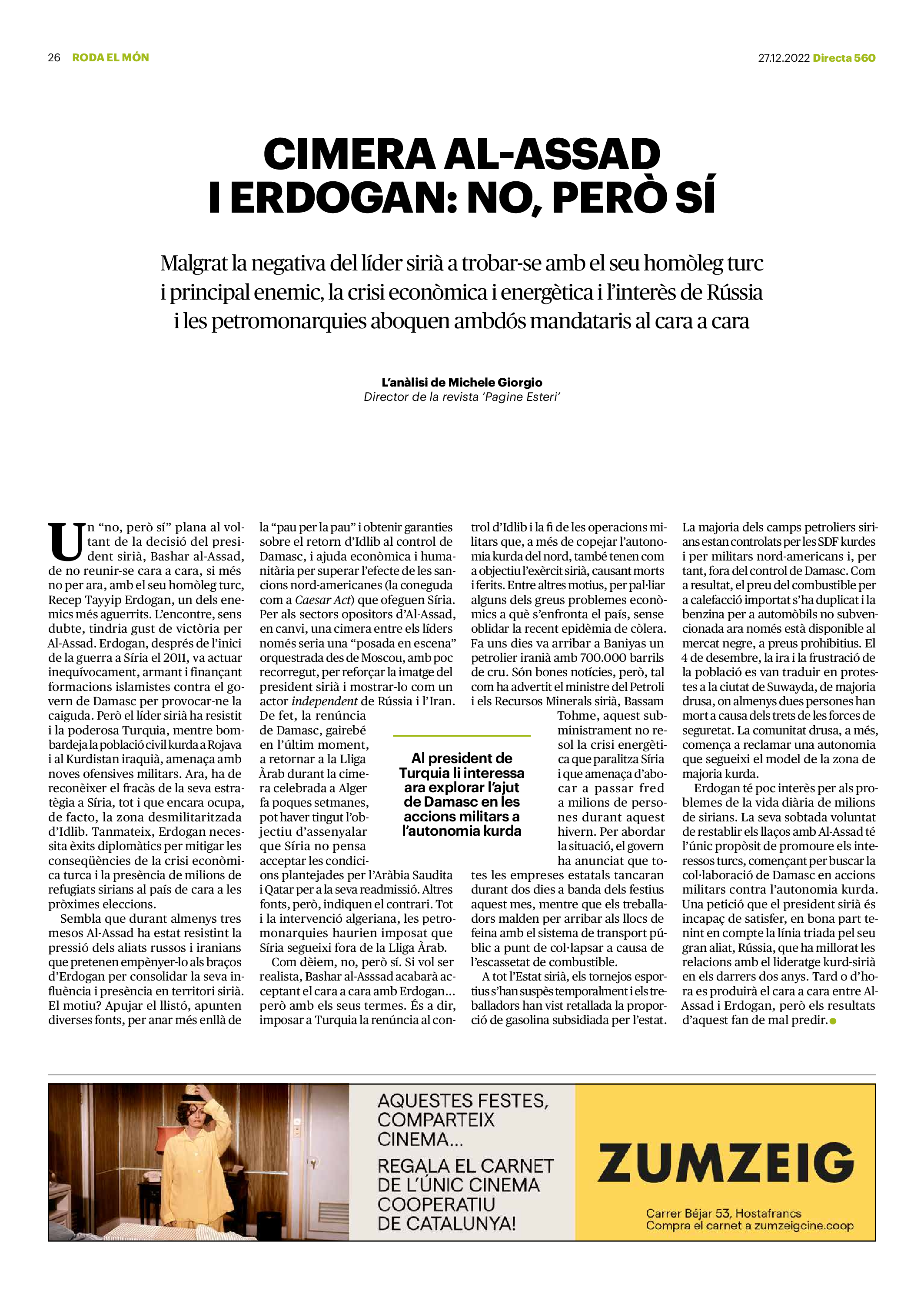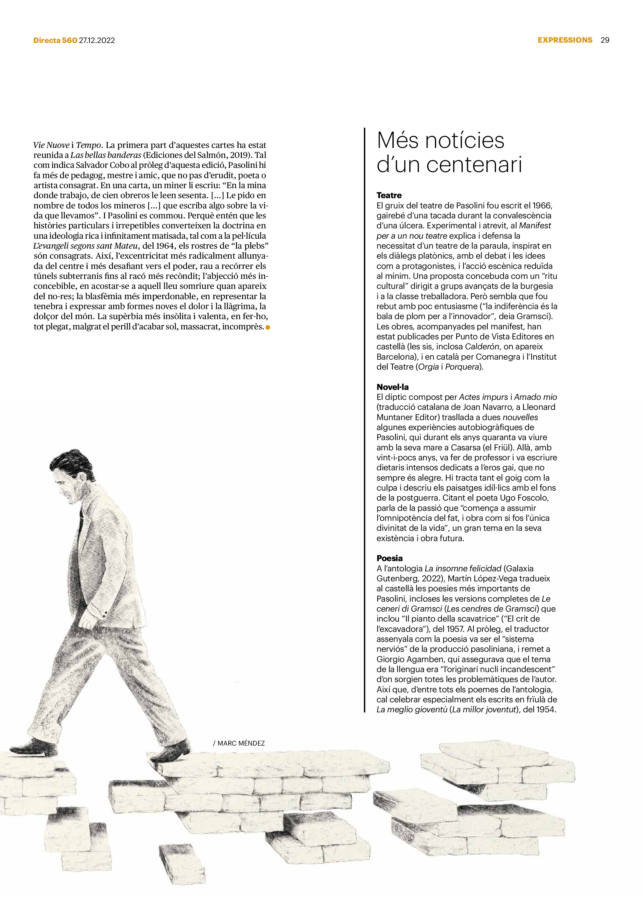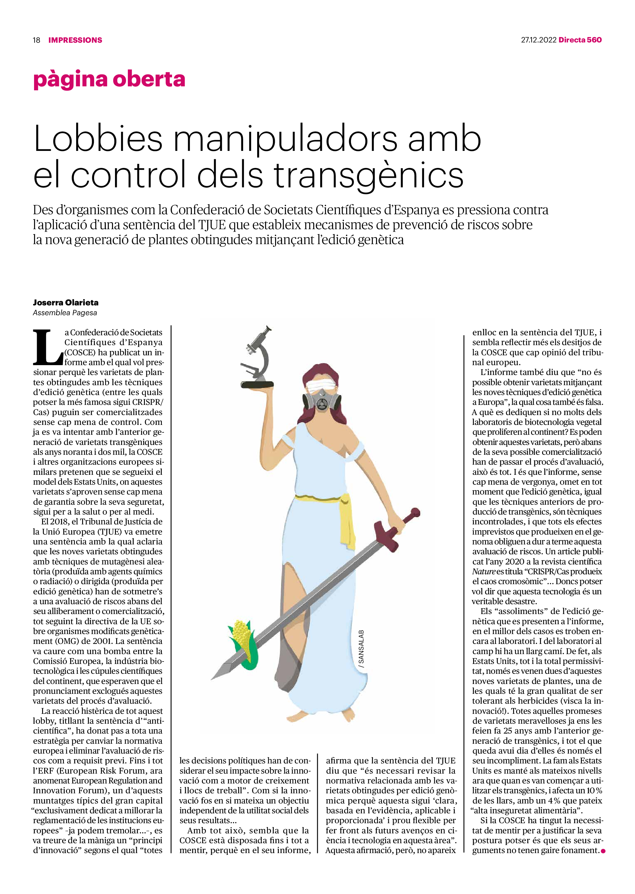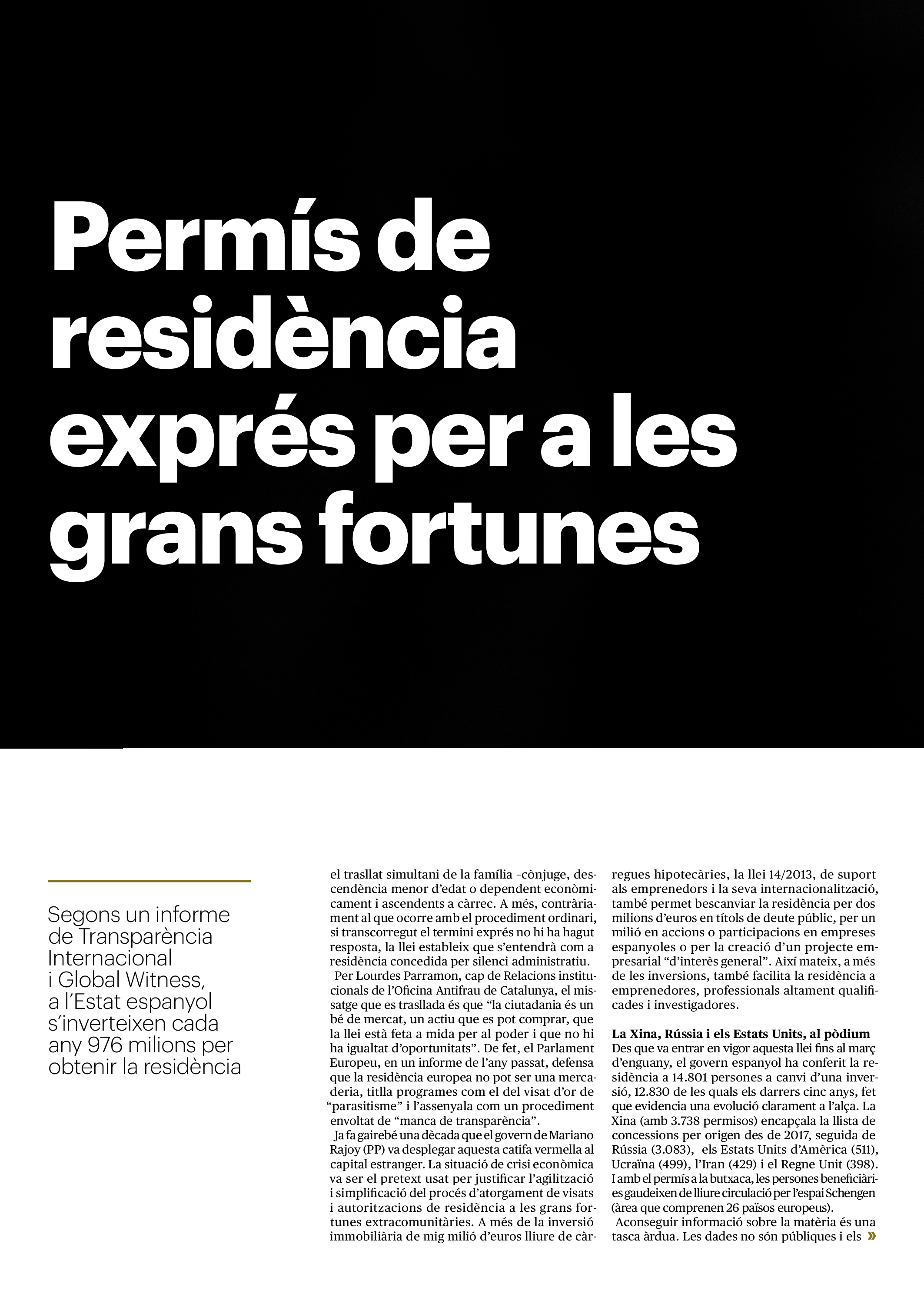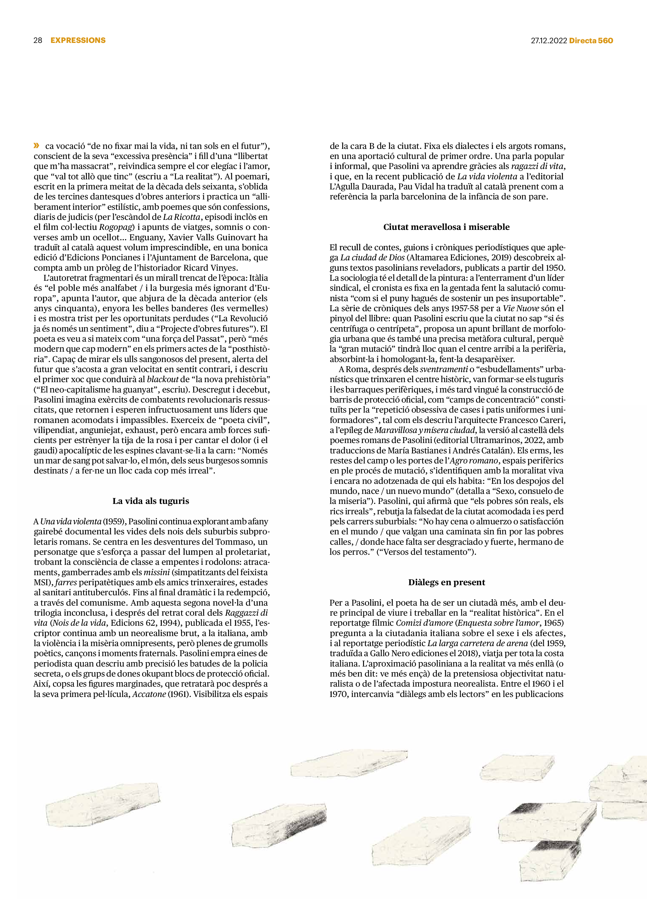 'Directa 560' Pantalla completa Descarregar 1 2-3 4-5 6-7 8-9 10-11 12-13 14-15 16-17 18-19 20-21 22-23 24-25 26-27 28-29 30-31 Consulta el resum del número 560 Què hi trobem, a la ‘Directa’ 560? A fons A Fons Permís de residència exprés per a les grans fortunes Gemma Garcia Imatges | Victor Serri A Fons Portugal, escàndols de corrupció i un fre limitat Marc Iglesias Imatges | Arxiu A Fons Un laberint burocràtic per milers de persones David Bou Imatges | Victor Serri Crüilla Cruïlla Sabors compartits Laura Font Sentís Imatges | Claudia Clavell Expressions Expressions Pasolini, més modern que cap modern Ivan Alcázar Serrat Imatges | Marc Méndez Expressions Si la teva mort fos un vestit Olga Codina Imatges | Tània Manzanal Cerdà Expressions Utopia llibertària als marges de l’Imperi romà Josep Pimentel Expressions Una de pirates i altres dissidències contra el poder colonial Eloi Latorre Miralls Miralls “La falsa idea de ‘progrés’ històric queda per a l’home heterosexual, blanc i ric” Anna Iñigo Imatges | Carlos Baglietto Roda el mon Roda el món La fractura social s’eixampla al Perú José de Echave Cáceres Imatges | Arxiu Roda el món La no-violència, víctima de la guerra a Ucraïna Maties Lorente Imatges | Roman Baluk Roda el món Cimera Al-Assad i Erdogan: no, però sí Michele Giorgio Imatges | Arxiu Indirecta Indirecta “El riu Cauca també necessita veritat i justícia” Berta Camprubí Imatges | Victor Serri Impressions Impressions El cas de Pablo Hasél o la disputa pel control del relat patrimonial Ibán Martínez Cárceles Imatges | Borja Lozano Impressions Lobbies manipuladors amb el control dels transgènics Joserra Olarieta Imatges | SANSAlab Donacions Fes una donació 5€ 10€ 20€ 50€ + FES UN DONATIU