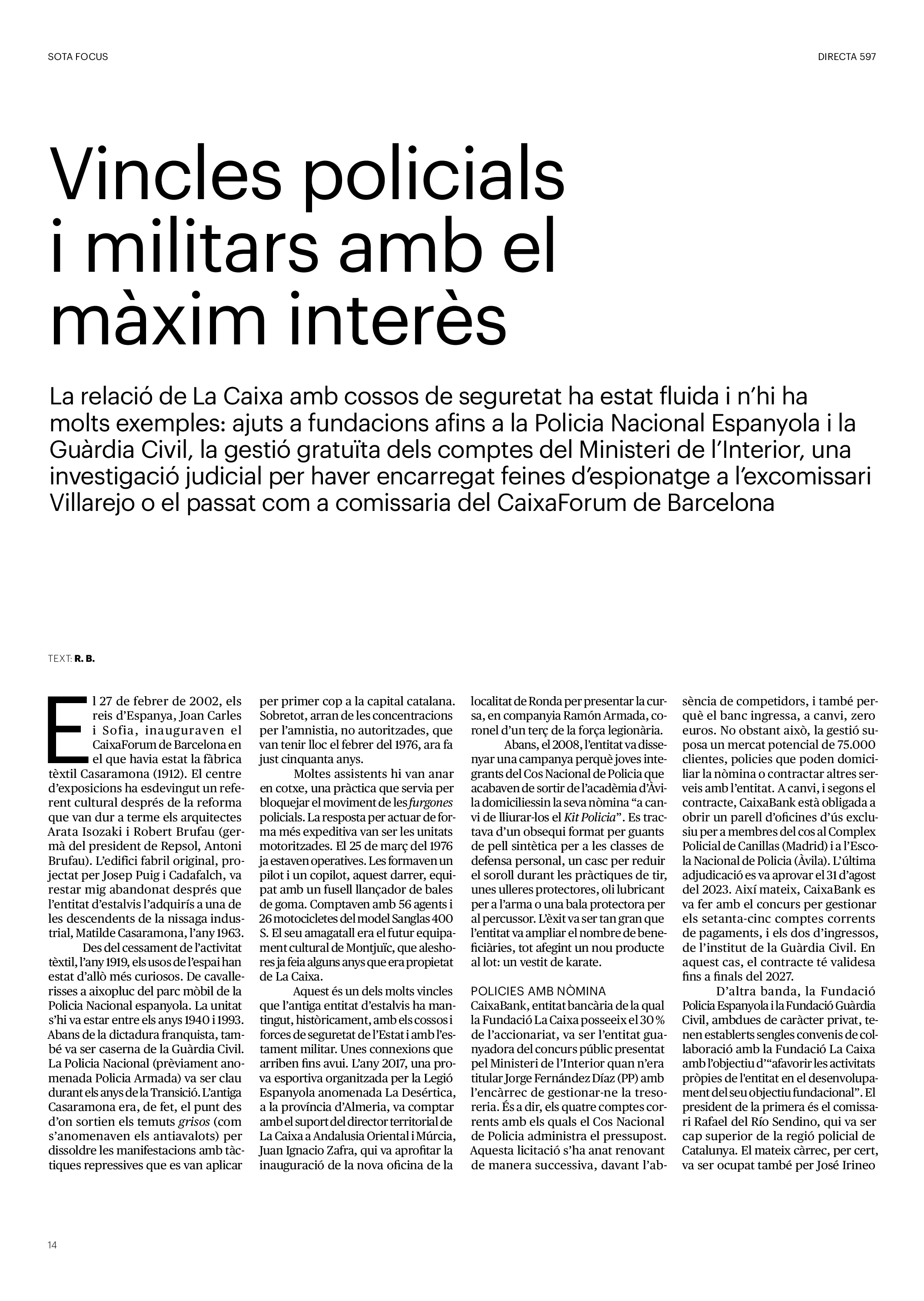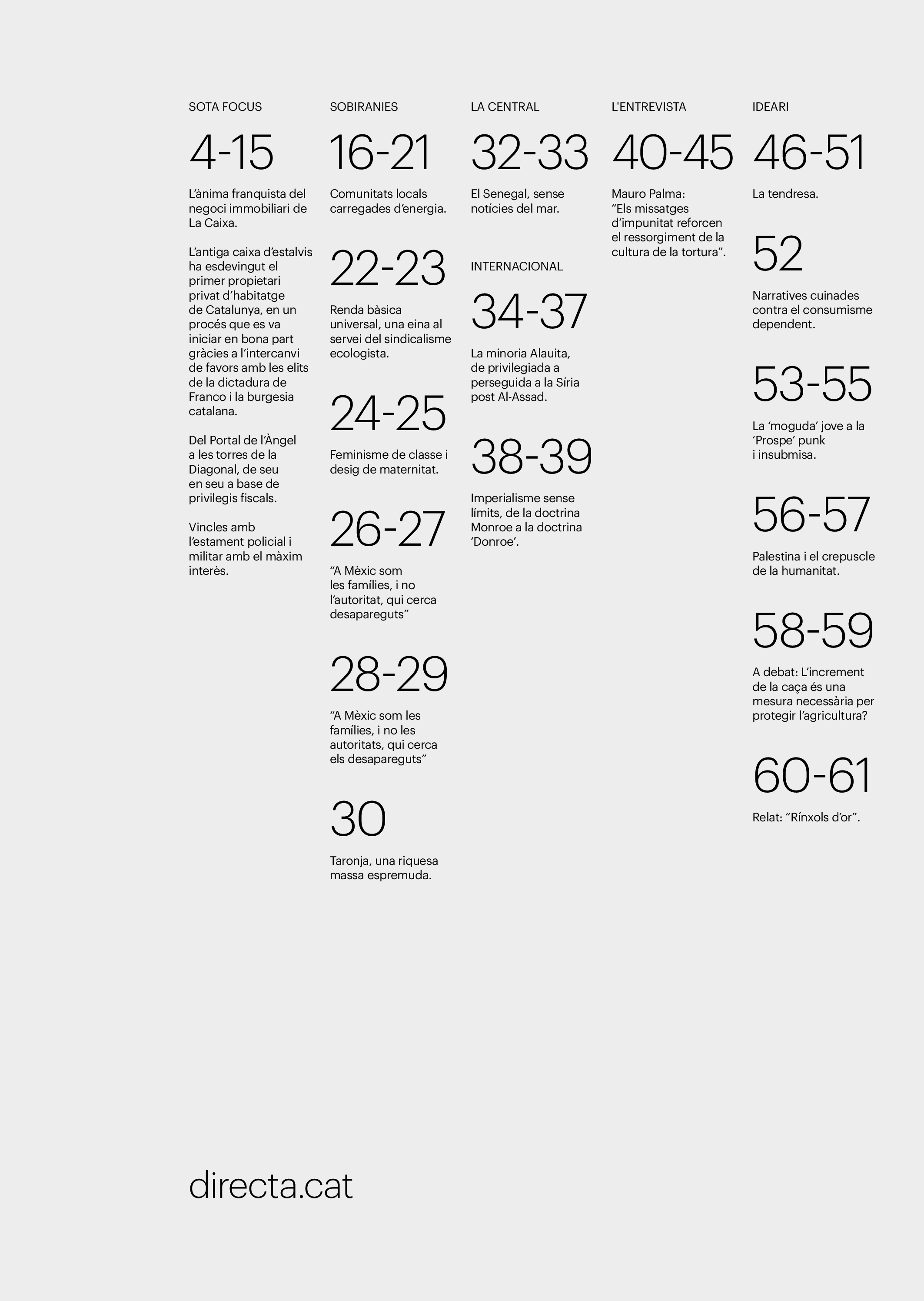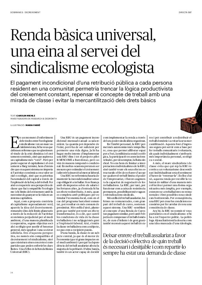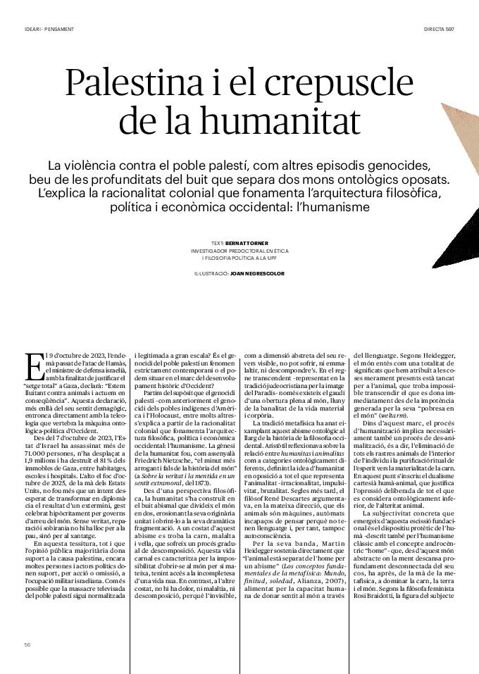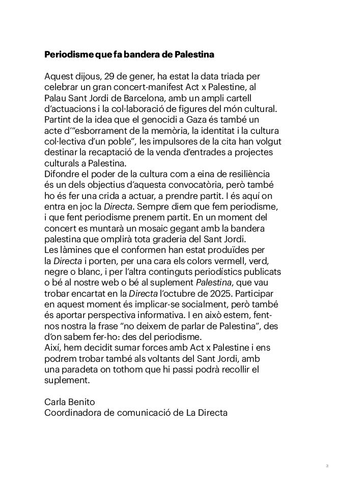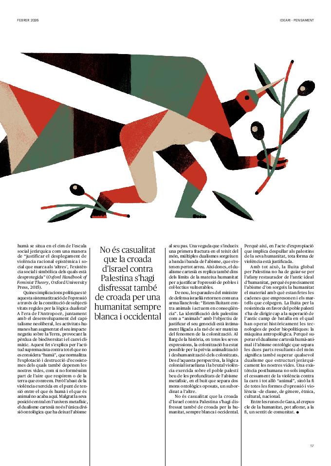 'Directa 597' Pantalla completa Descarregar 1 2-3 4-5 6-7 8-9 10-11 12-13 14-15 16-17 18-19 20-21 22-23 24-25 26-27 28-29 30-31 32-33 34-35 36-37 38-39 40-41 42-43 44-45 46-47 48-49 50-51 52-53 54-55 56-57 58-59 60-61 62-63 SOTA FOCUS Sota Focus L’ànima franquista del negoci immobiliari de La Caixa Rafa Burgos Imatges | Joanna Chichelnitzky Sota Focus De seu en seu a base de privilegis fiscals Rafa Burgos Imatges | Joanna Chichelnitzky Sota Focus Vincles policials i militars amb el màxim interès Rafa Burgos Imatges | Diputació de Màlaga INTERNACIONAL Internacional La caiguda en desgràcia de la minoria alauita Pau Alarcón Imatges | Pau Alarcón Internacional Imperialisme sense límits, de Monroe a ‘Donroe’ Beth Geglia Imatges | OTAN L'ENTREVISTA L'entrevista “El delicte de tortura no hauria de ser objecte d’indult ni d’amnistia” Gemma Garcia Imatges | Joanna Chichelnitzky SOBIRANIES Sobiranies Quan el veïnat es carrega d’energia Jesús Rodríguez Imatges | Ona Bros (La Fuga Coop) Fórmules Boscos madurs, us necessitem Verónica Couto Antelo Decreixement Renda bàsica universal, una eina al servei del sindicalisme ecologista Carolin Miehle Imatges | Maria Farré Vincles El feminisme de classe i el desig de maternitat Gemma Tadeo López Mari Villar Imatges | Clara-Iris Ramos Indirecta “A Mèxic som les famílies, i no l’autoritat, qui cerca desapareguts” Jordi Campabadal Graus Imatges | Victor Serri Rebost Taronja, una riquesa massa espremuda Giuseppe Savino IDEARI Ideari La tendresa va en direcció contrària Carme Roig Canal Imatges | Joanna Chichelnitzky Imperdibles Recuperem les cuines contra el consumisme dependent Jordi Garcia Miravet De memòria La ‘moguda’ jove d’aquella ‘Prospe’ punk i insubmisa Roger Costa Puyal Imatges | Cristina Lavilla Pensament Palestina i el crepuscle de la humanitat Bernat Torner Imatges | Joan Negrescolor Accents El problema no és la fauna, és la precarietat de la pagesia Jaume Grau i López Imatges | Pau Fabregat Accents Un sector perjudicat per anys d’inacció de les administracions Josep Carles Vicente Caplletra Rínxols d’or Àngela Baldó Llinares Imatges | Pepepue Donacions Fes una donació 5€ 10€ 20€ 50€ + FES UN DONATIU