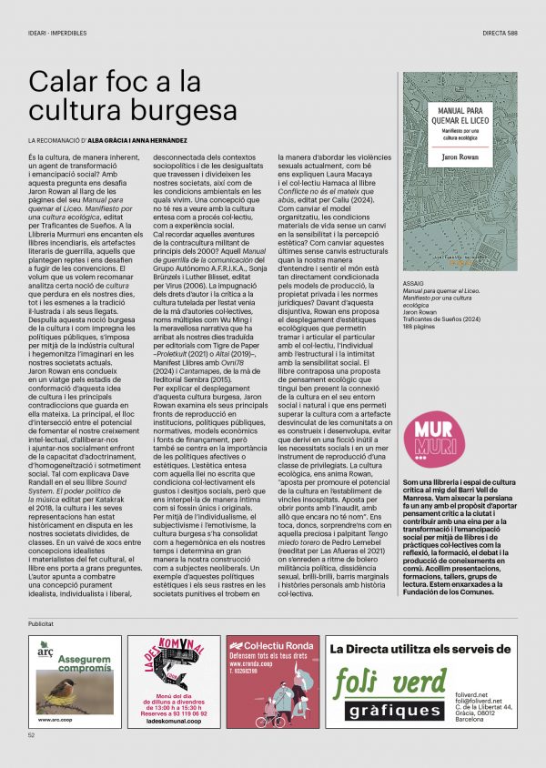 'Directa' 588 Pantalla completa Descarregar 1 2-3 4-5 6-7 8-9 10-11 12-13 14-15 16-17 18-19 20-21 22-23 24-25 26-27 28-29 30-31 32-33 34-35 36-37 38-39 40-41 42-43 44-45 46-47 48-49 50-51 52-53 54-55 56-57 58-59 60-61 62-63 SOTA FOCUS Sota Focus L’extrema dreta alimenta la por als carrers Jesús Rodríguez Imatges | Pol ortega Sota Focus Els llops solitaris i les seves manades Roger Suso Imatges | Arxiu Sota Focus Extrema dreta ‘big tech’ Albert Alexandre Imatges | Pau Fabregat SOBIRANIES Sobiranies Un sostre per a moltes lluites Guillem Martí Imatges | Roser Gamonal Fórmules Més salut col·lectiva per combatre l’estrès crònic Mar Barrantes Imatges | Diego Muñoz Decreixement Un tast de barbaritat porcina al Moianès Maia del Tento Imatges | Pepe Serra Vincles La força política de col·lectivitzar el patiment Ana Cameros Zabala Javier Erro Imatges | Ivonne Navarro Indirecta “Amb l’atenció primària al món rural es fan vincles impensables a la ciutat” Vicent Almela Imatges | Miguel Ángel Troncho Rebost Un fruit ple de sabor i de riquesa dialectal Giuseppe Savino Imatges | Victor Serri IDEARI Ideari Fer llibres (més) sostenibles Eloi Latorre Imatges | Victor Serri / Pau Fabregat Imperdibles Calar foc a la cultura burgesa Alba Gràcia Anna Hernández Imatges | Arxiu De memòria Antifeixisme al món àrab contra Franco, una qüestió colonial Marc Almodóvar Andreu Rosés Imatges | Pau Fabregat Pensament Aprendre les lliçons del professorat Santiago Garcia Tirado Imatges | Mevaki Accents Sí rotund, per fer-lo feminista i popular, i amb els meus impostos Irene Zugasti Accents Més moviments socials en antena i menys premsa rosa Vicent Canet Caplletra zeitnot Pseudònimus Malapècory Imatges | Amaia Moran INTERNACIONAL Internacional La crisi industrial alemanya impulsa la ultradreta Andreu Jerez Imatges | Arxiu Internacional Terres rares, la nova mineria espoliadora vestida de verd Clàudia Custodio Imatges | equip ODG L'ENTREVISTA L'entrevista “El sionisme és l’intent colonialista de crear una Europa fora d’Europa” Oriol Andrés Gallart Imatges | Victor Serri Donacions Fes una donació 5€ 10€ 20€ 50€ + FES UN DONATIU