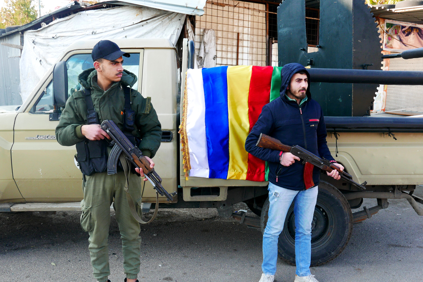 A les entrades dels barris kurds d’Ashrafiyeh i Sheikh Maqsoud de la ciutat d’Alep, la segona més gran de Síria, hi ha punts de control integrats per membres del Ministeri de l’Interior i de les Forces Democràtiques Sirianes (FDS), la milícia prokurda que controla el nord-est del país. “La situació és tranquil·la al barri, no hi ha cap mena de tensió després de l’acord del mes d’abril”, explica Tahar, un cuiner kurd d’Ashrafiyeh, en referència al pacte entre el Consell Municipal dels dos barris kurds i representants del govern de Damasc. De moment, però, la seguretat en aquest sector continua sent responsabilitat de les FDS, i el consell és el que gestiona els serveis públics dels barris.
