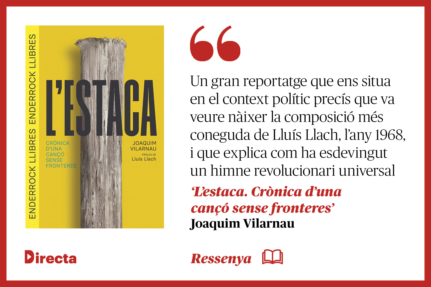 El Grup Enderrock, responsable de la revista musical del mateix nom, ha estrenat una nova línia editorial de llibres de temàtica musical que ha obert un dels seus més coneguts i prolífics col·laboradors, el periodista Joaquim Vilarnau. Ho fa amb una monografia dedicada a una de les cançons més populars de la Catalunya contemporània, “L’estaca”, escrita per Lluís Llach, que, com no podia ser més escaient, signa el pròleg del llibre.